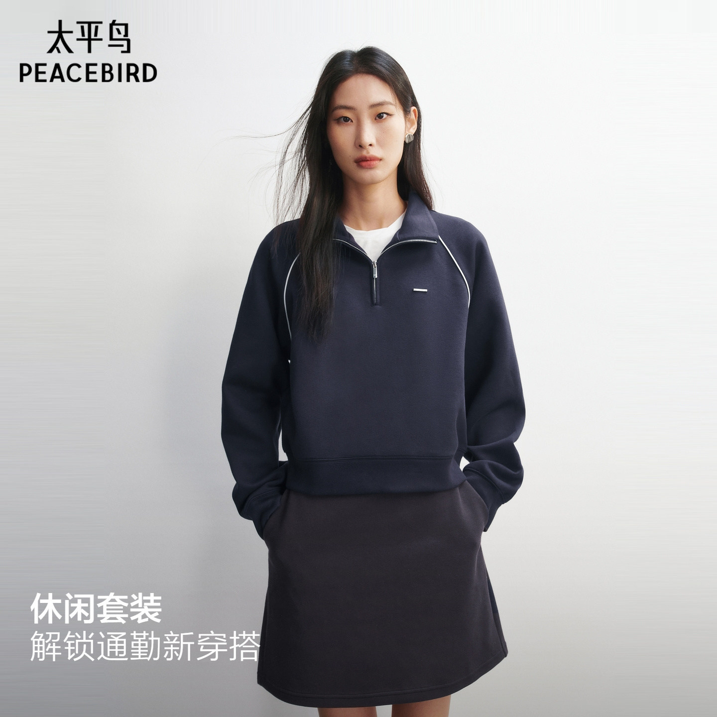 【商场同款】太平鸟半拉链藏青色卫衣套装连衣裙女新款A3FCG1201