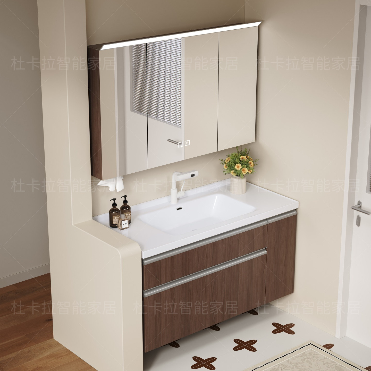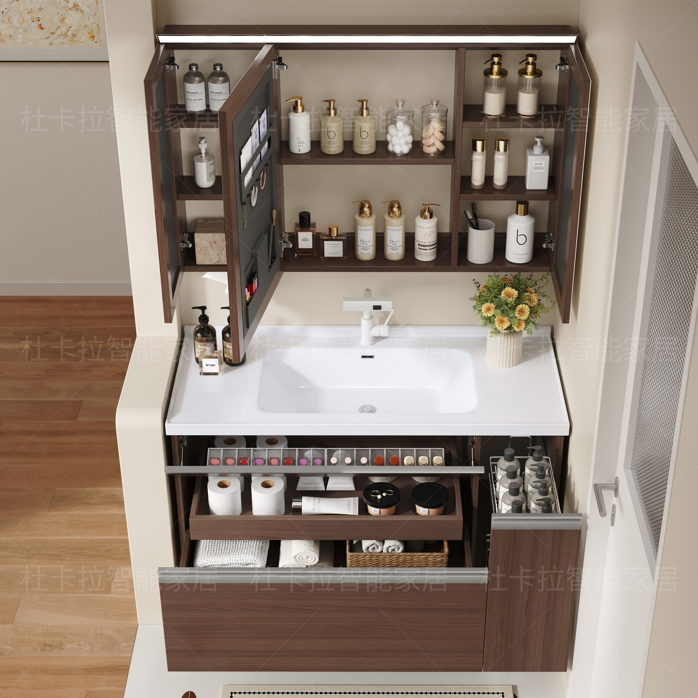 多元收纳卫生间浴室柜组合胡桃木色浴室镜柜组合金脸台陶瓷一体盆