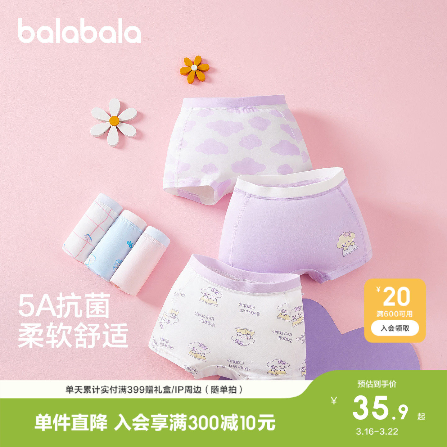 迷你巴拉巴拉儿童内裤男女宝宝抑菌不夹pp四角短裤5条装棉平角裤