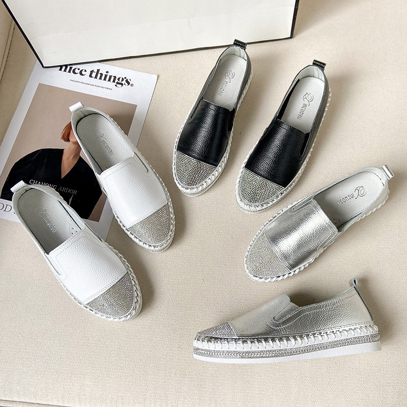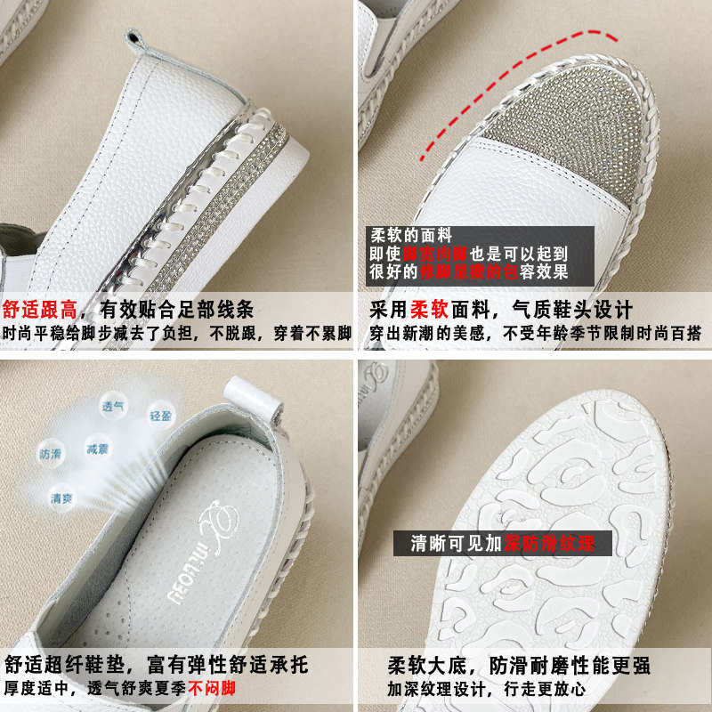乐福鞋女春秋一脚蹬真皮厚底懒人鞋软牛皮小白鞋女平底水钻单鞋夏