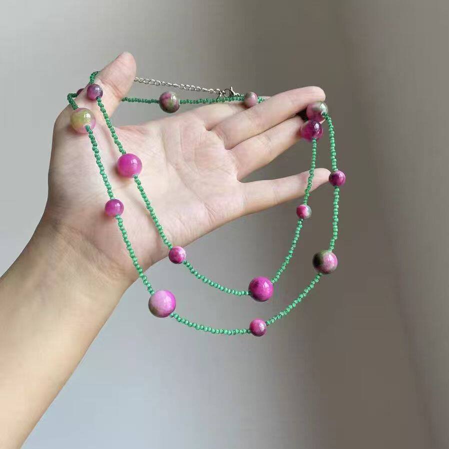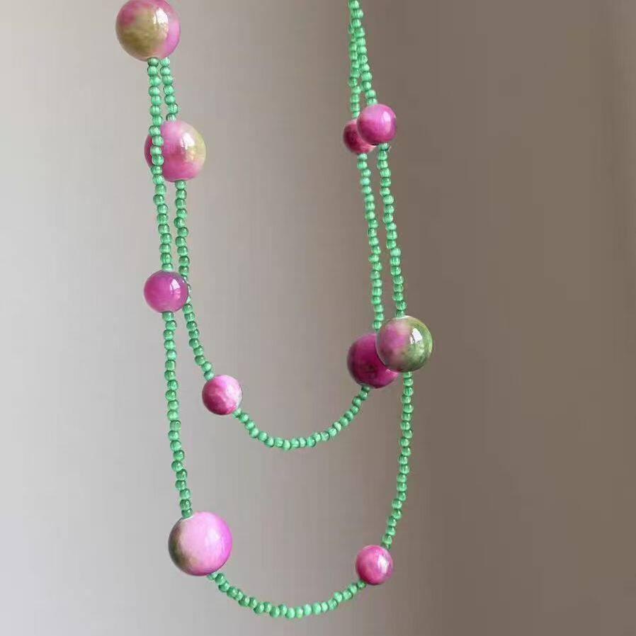 新中式国风紫绿撞色手工串珠项链女文艺少女风长款叠戴颈链锁骨链