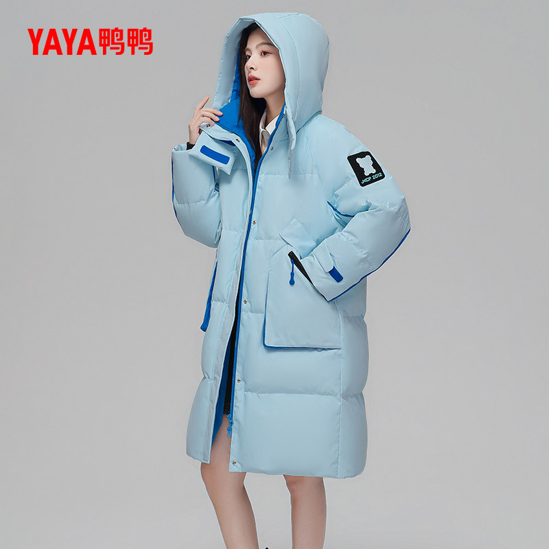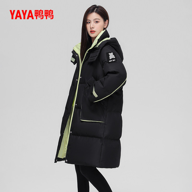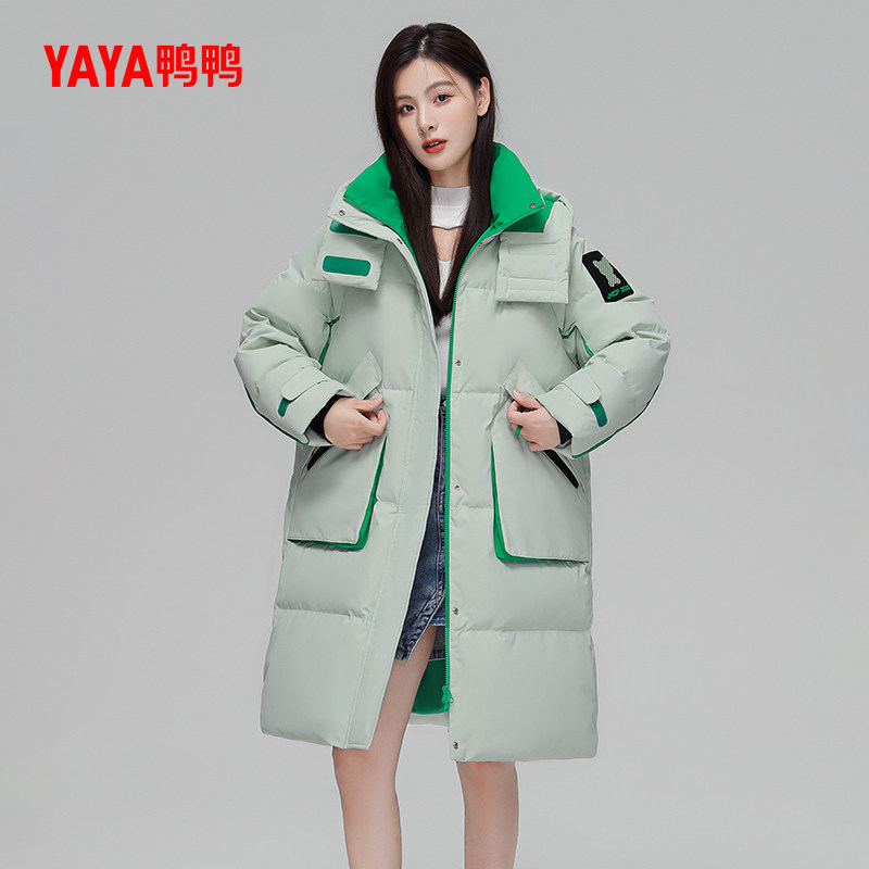 鸭鸭羽绒服女2025年冬季中长款过膝连帽时尚立领拼接色保暖外套A