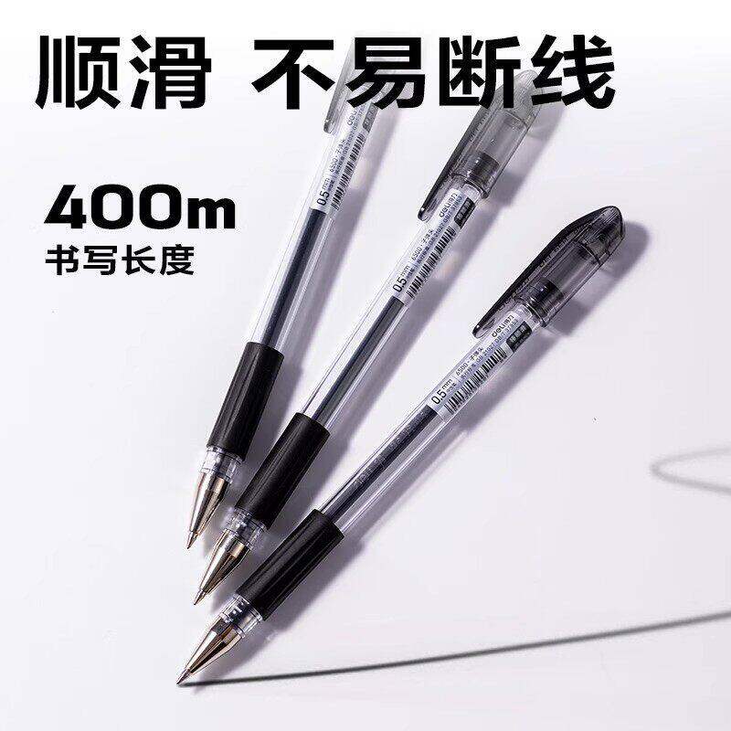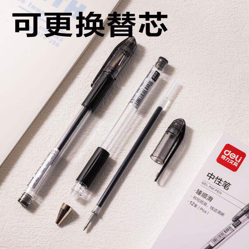 得力12支装中性笔0.5mm黑色红色蓝色顺滑大容量学习用品笔帽式子弹头日常书写商务学生通用刷题笔签字笔水笔