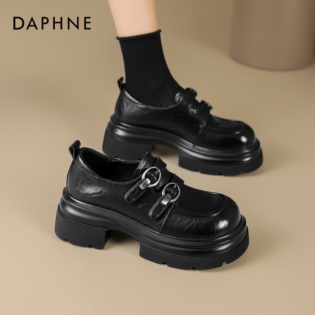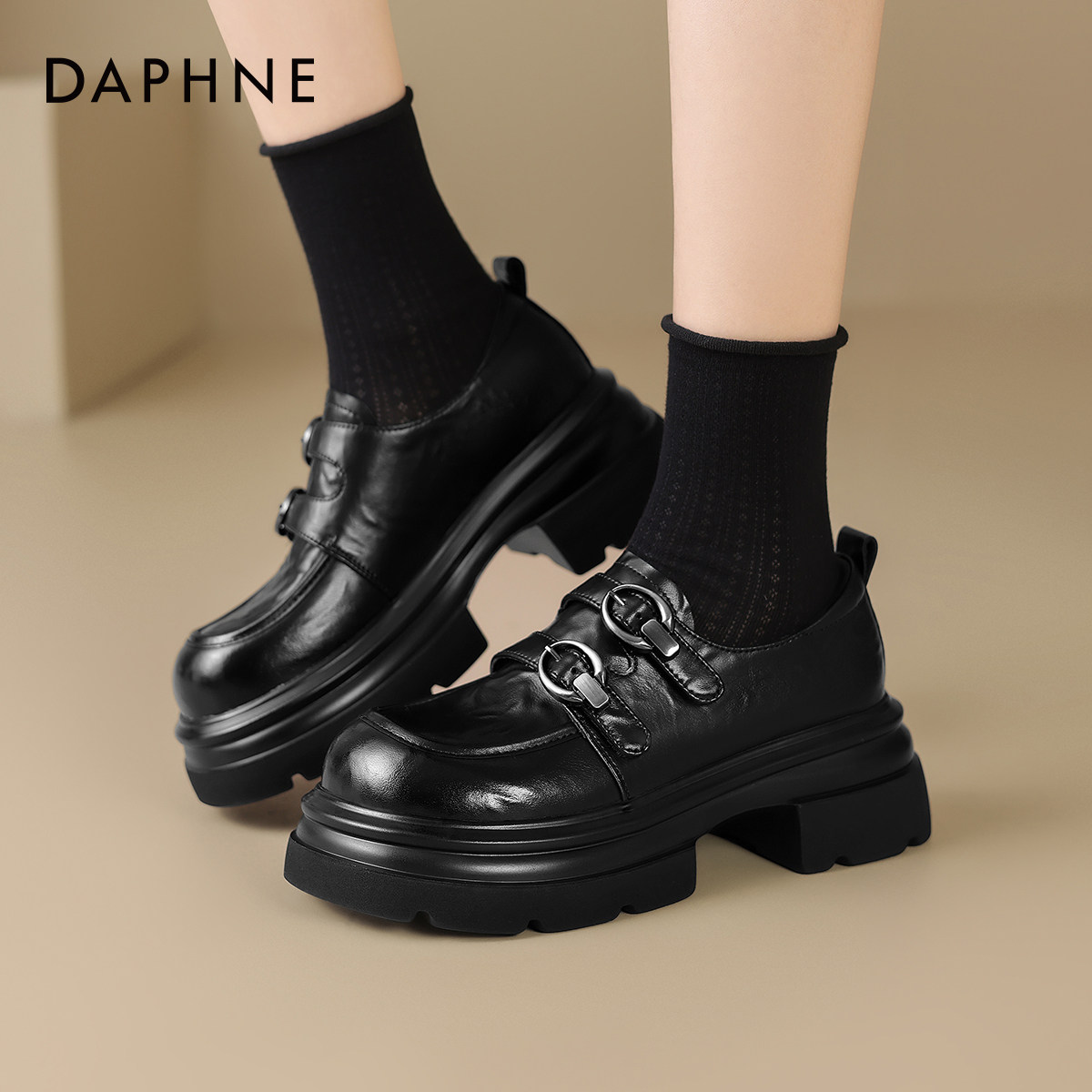 达芙妮厚底乐福鞋女2026新款英伦百搭黑色小皮鞋冬季粗跟增高单鞋