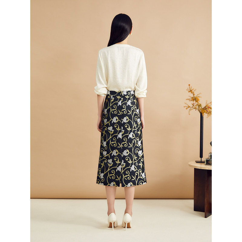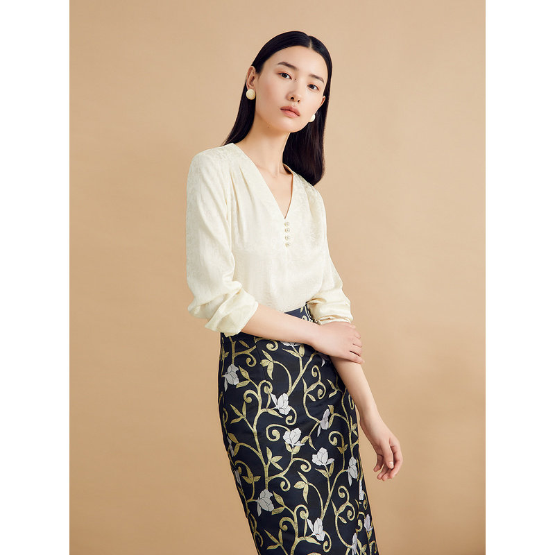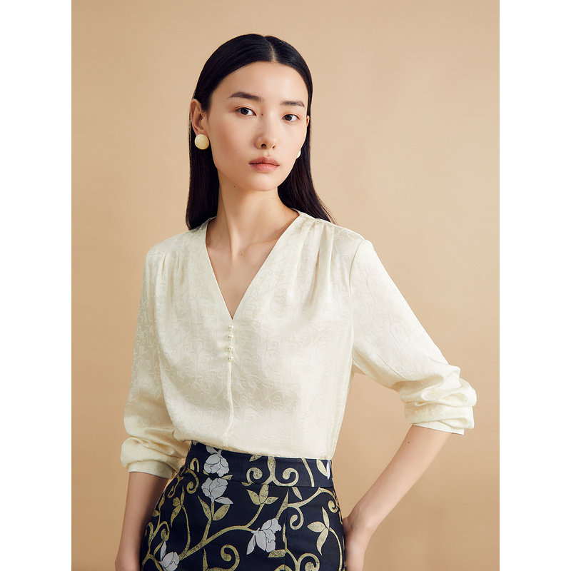 YINER音儿女装秋季法式诗意提花钉珠装饰V领桑蚕丝真丝衬衫上衣