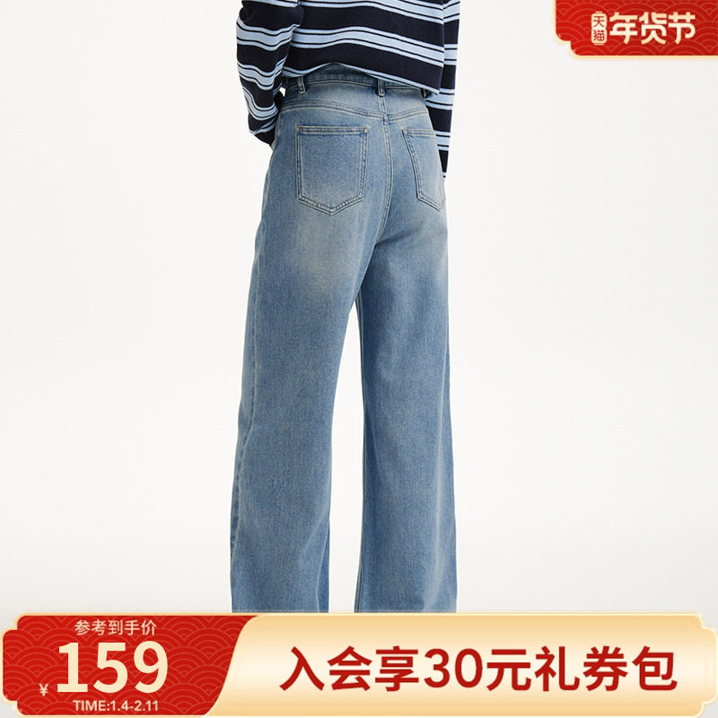 商场同款|森柔森马牛仔裤女冬高腰半松紧腰抓毛2025新款阔腿长裤