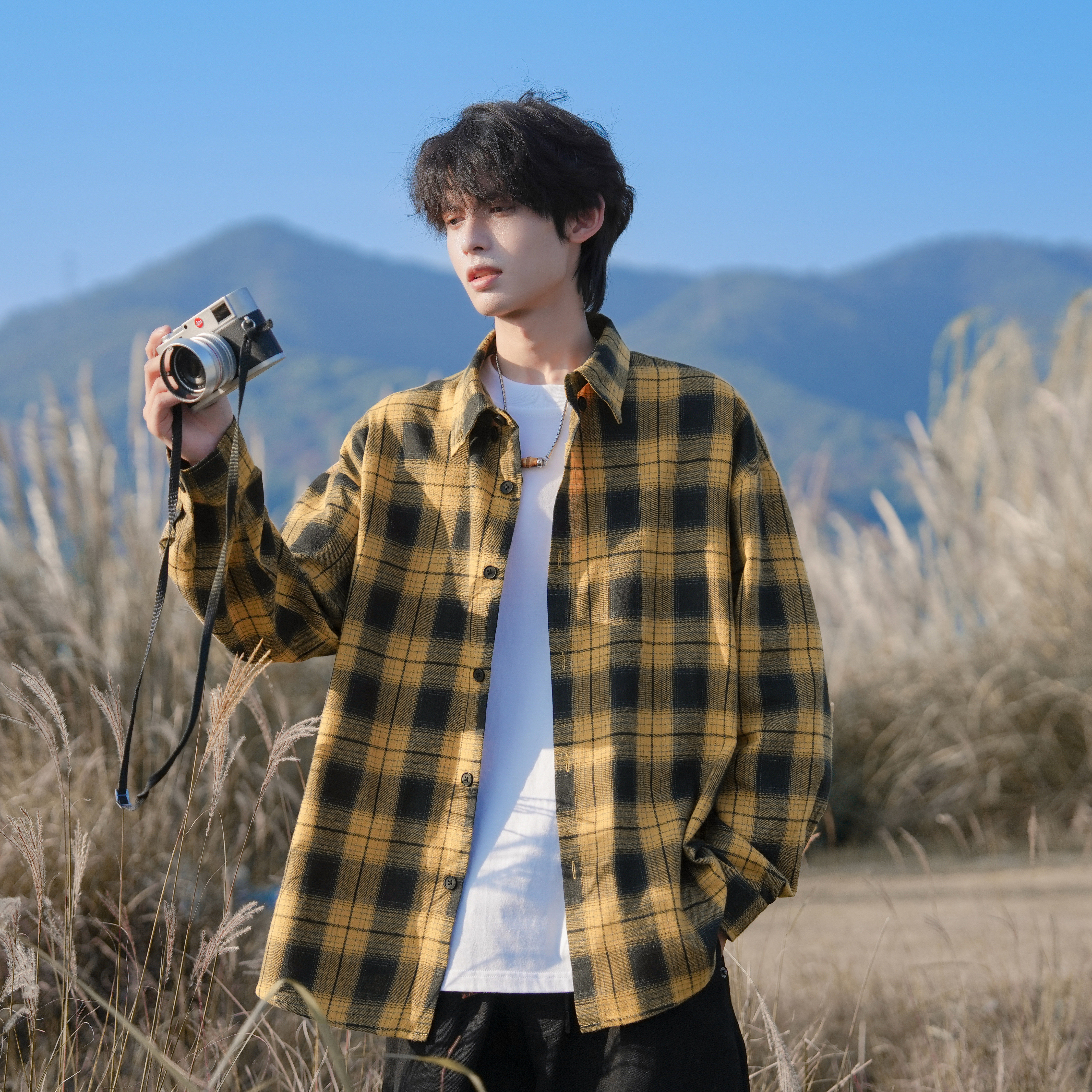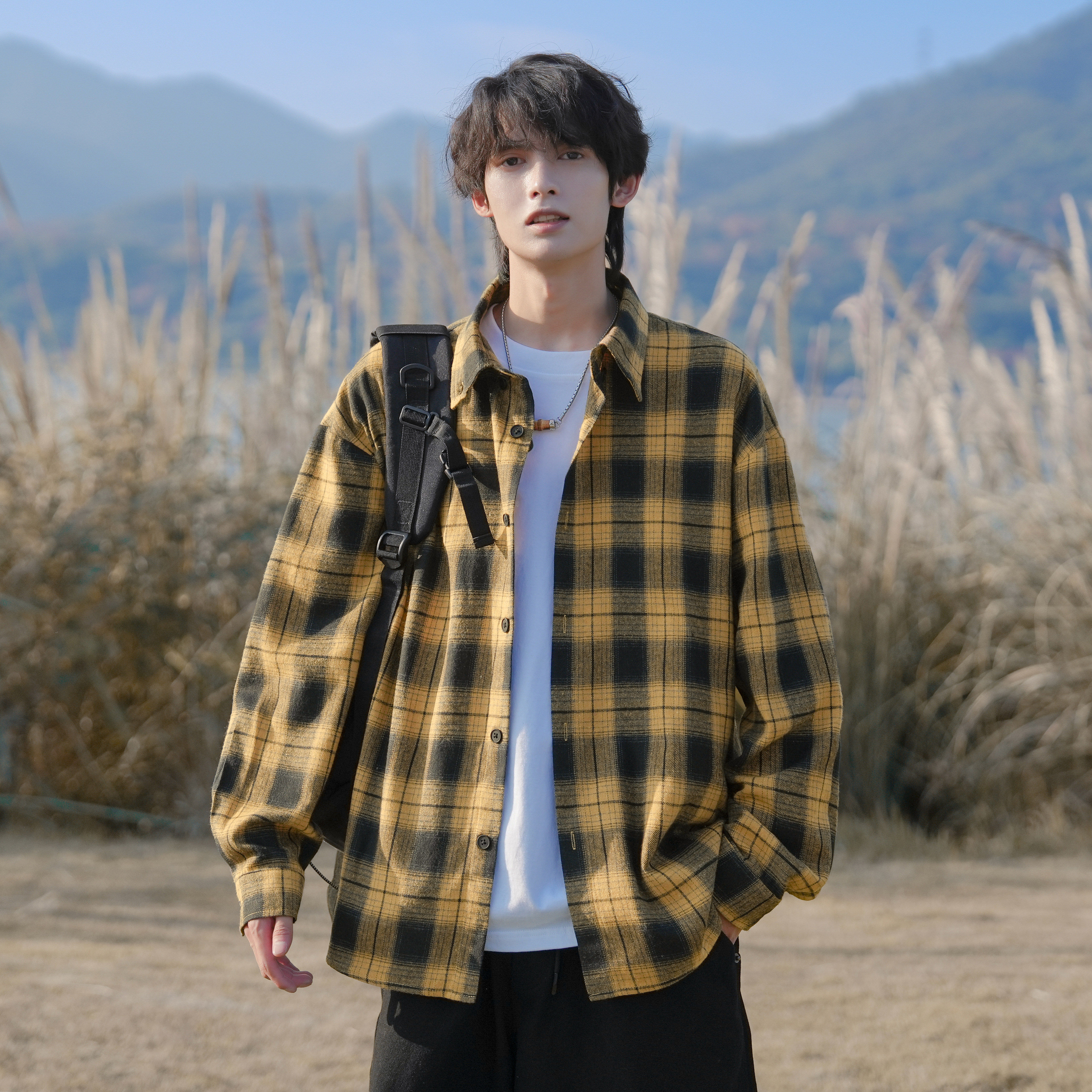 啄木鸟秋季新款男士长袖100%全纯棉磨毛格子衬衫 高级感休闲衬衣