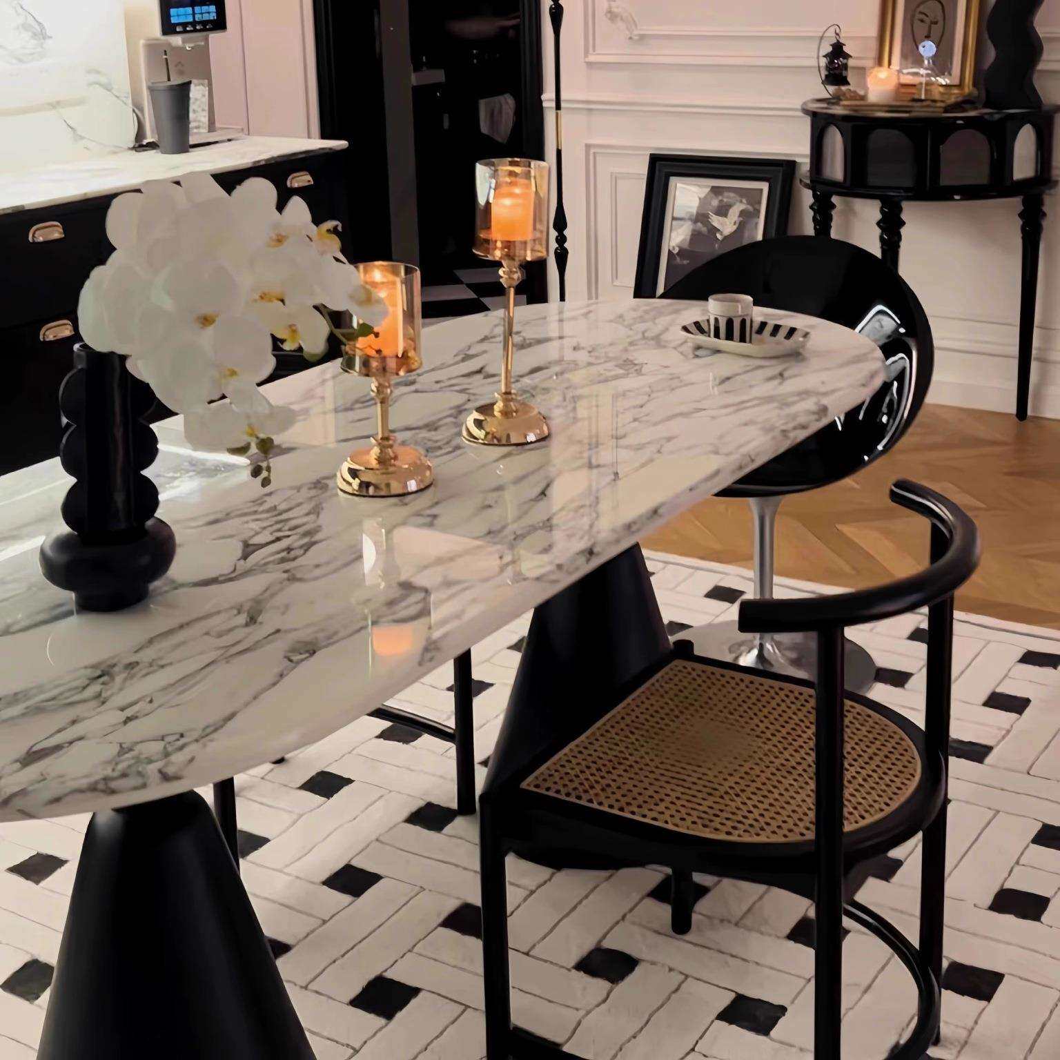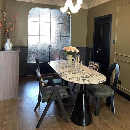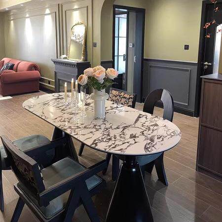 天然大理石餐桌圆形极简现代复古小户型法式圣杯微晶石吃饭长桌子