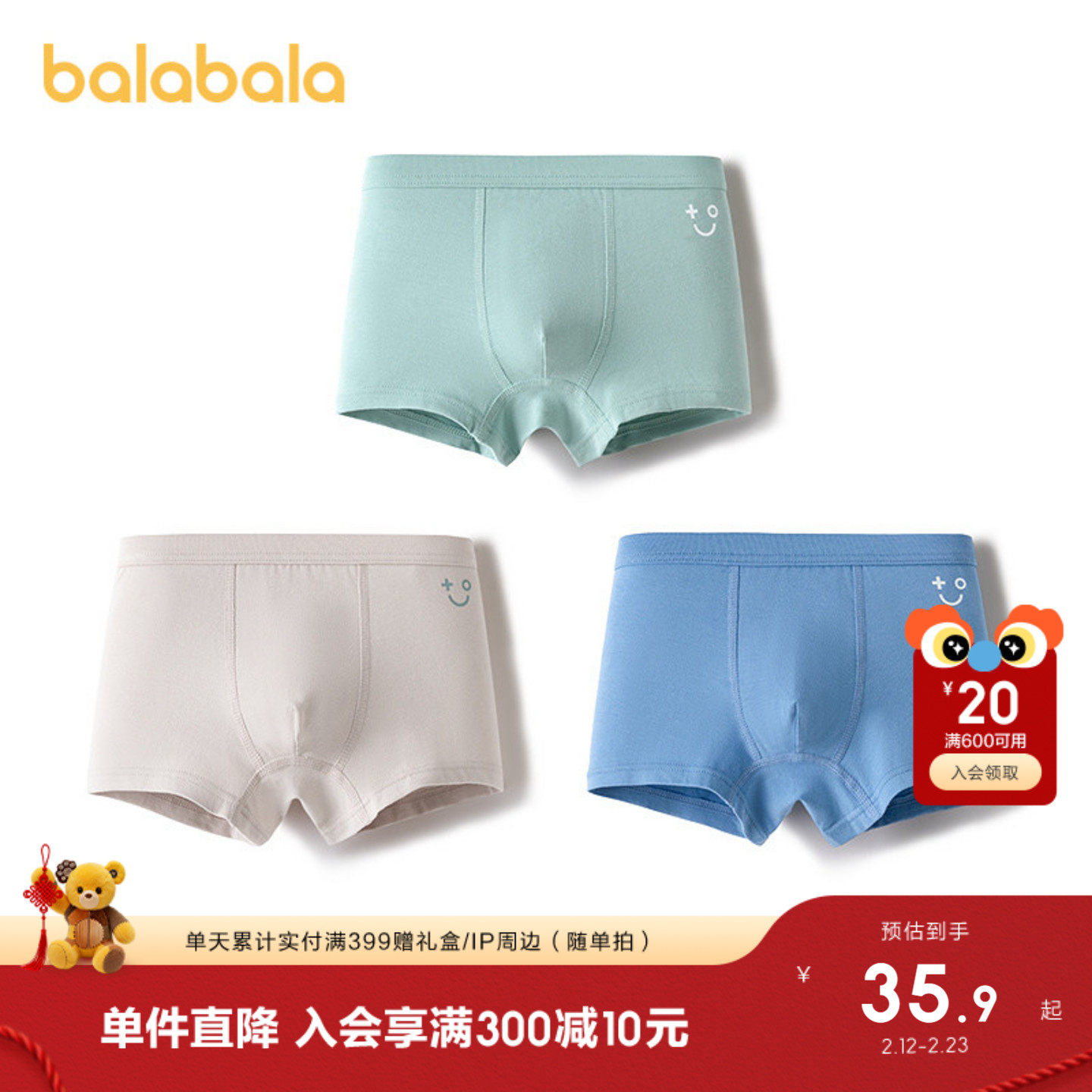 【balaOne】巴拉巴拉儿童内裤棉男童不夹pp抗菌裆四角短裤三条装