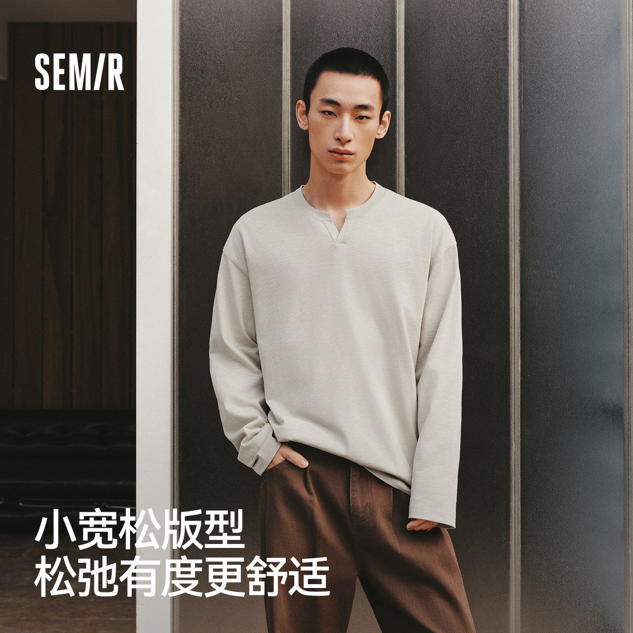 森马长袖T恤男纯色小v领内搭上衣2026春季新款宽松通勤百搭打底衣