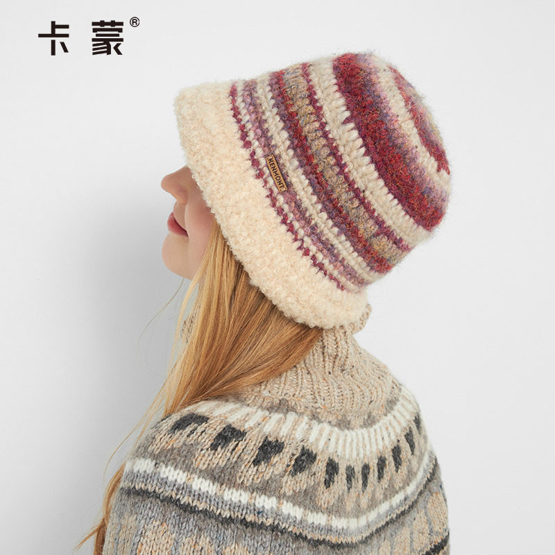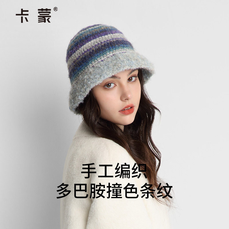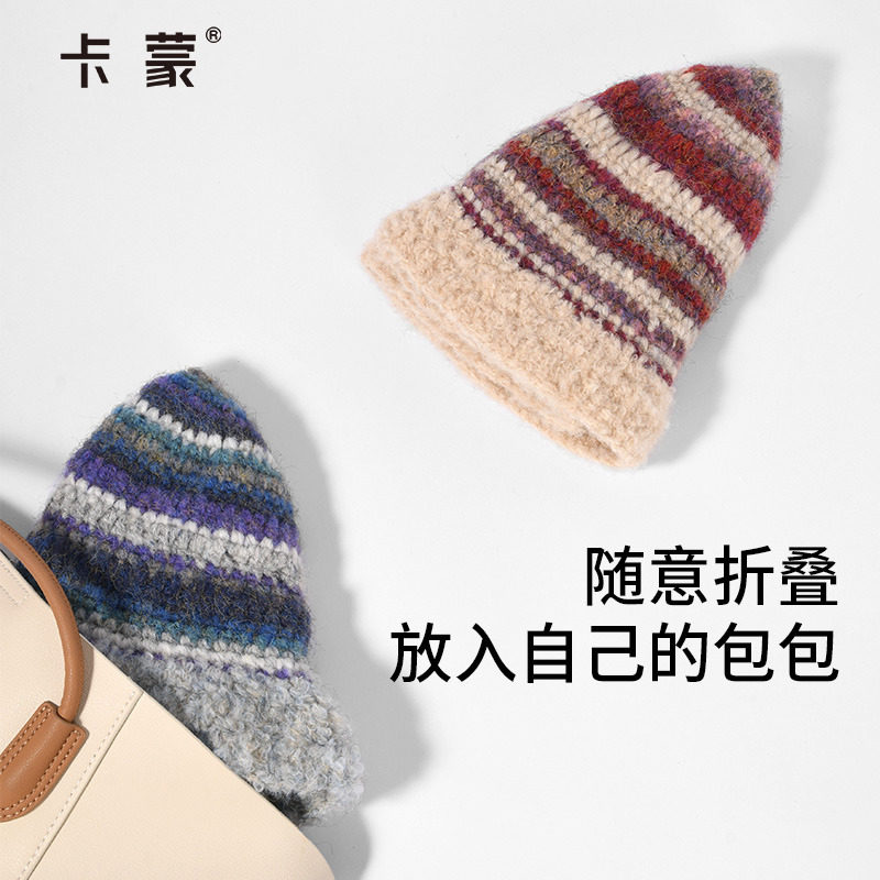 卡蒙毛绒渔夫帽女秋冬多巴胺条纹针织盆帽可折叠宽松水桶帽显脸小
