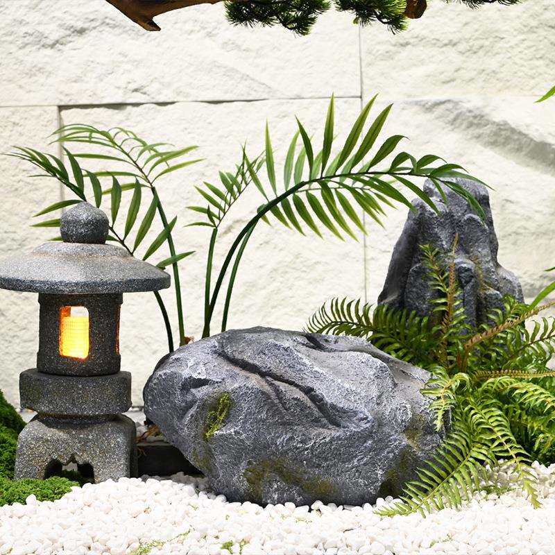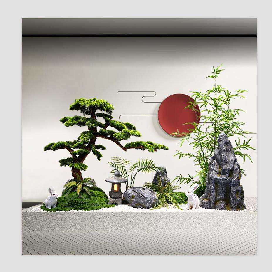 仿真迎客松假山石头新中式别墅庭院玄关装饰绿植宫灯高档造景摆件