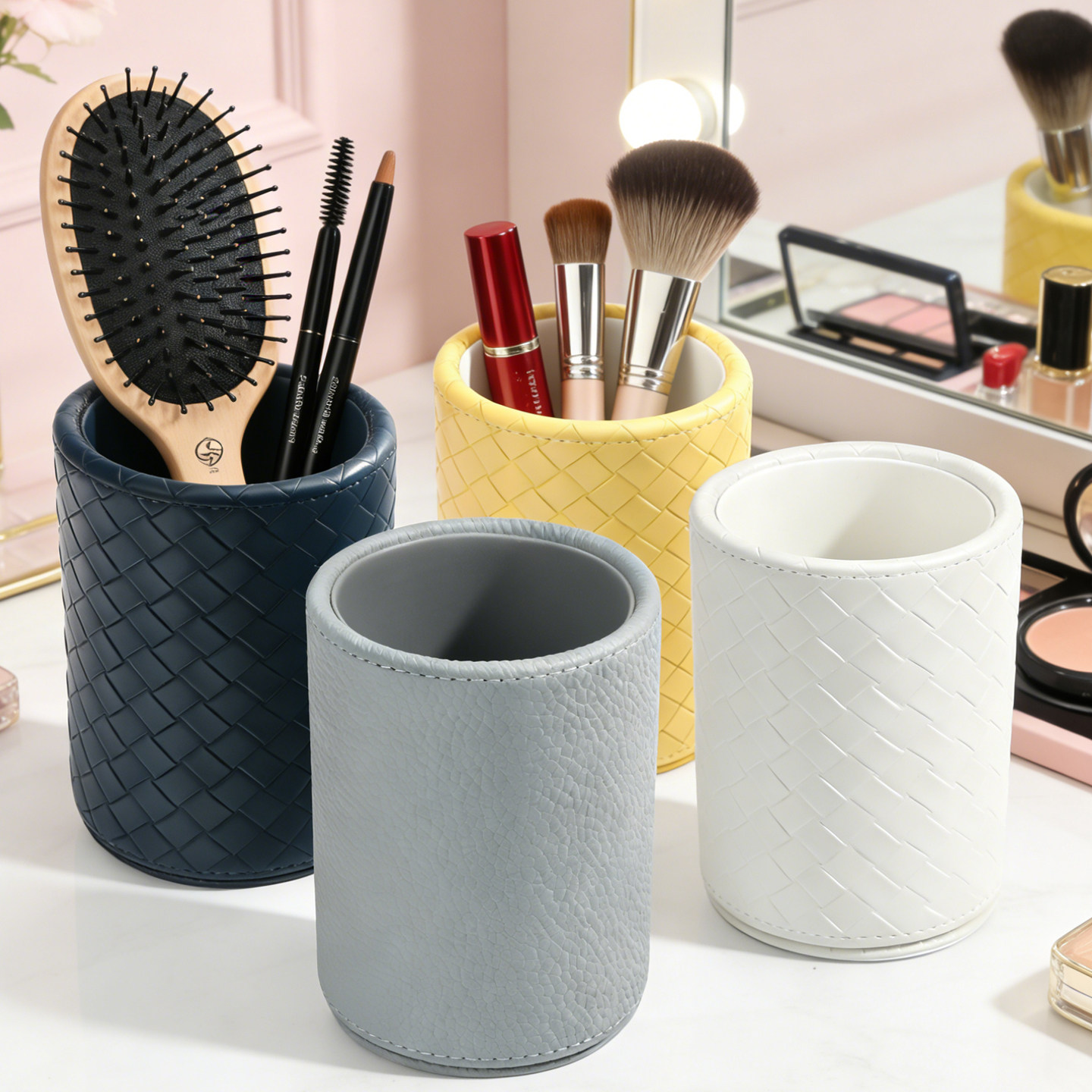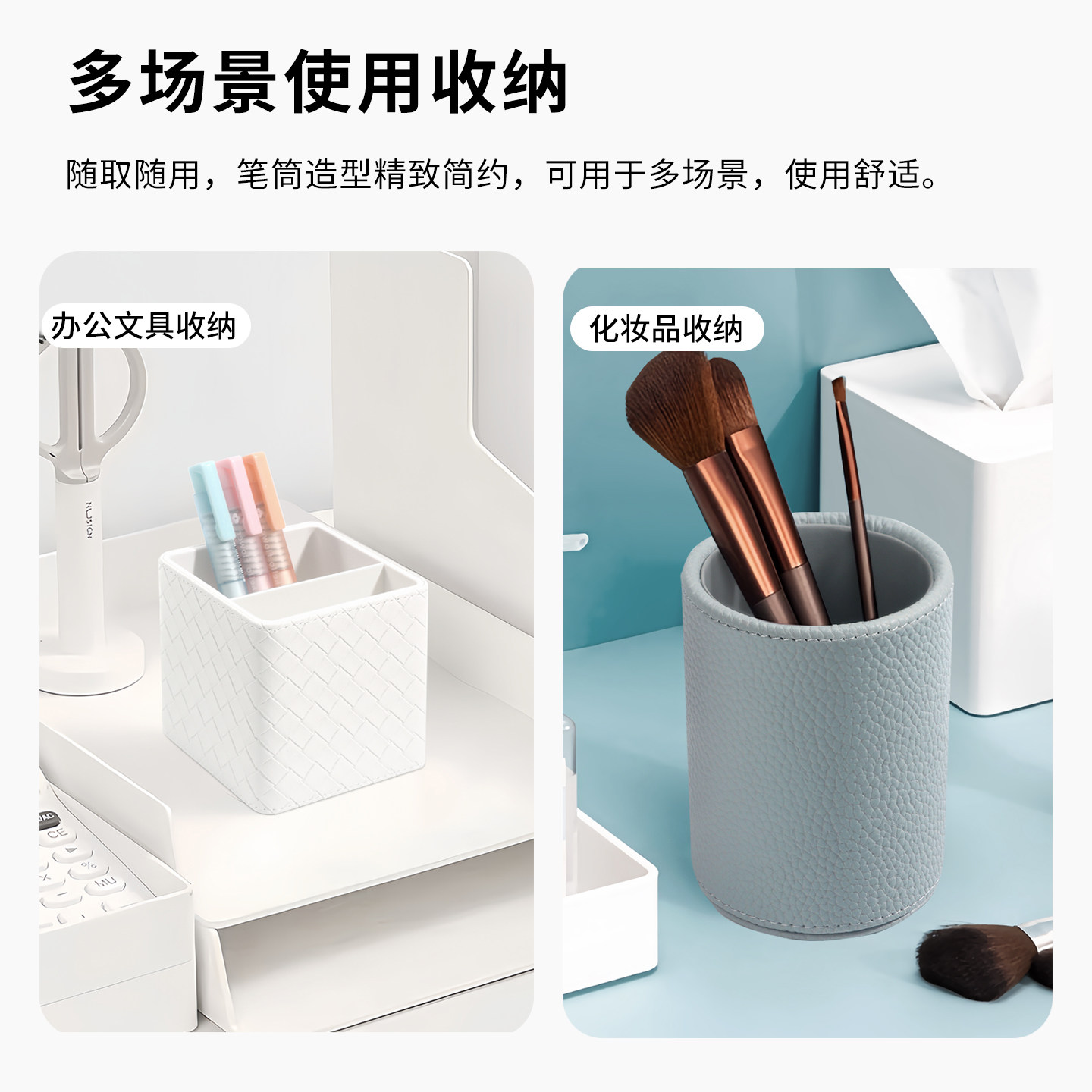 梳子化妆刷收纳筒高级感皮质圆形防尘梳妆台化妆品收纳盒口红眼影小置物架轻奢创意大容量桌面笔筒高颜值定制