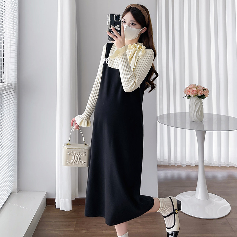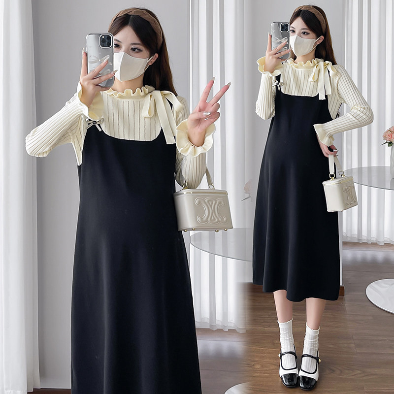婧麒孕妇连衣裙秋季2025新款气质拼接假两件圆领长袖针织毛衣裙女