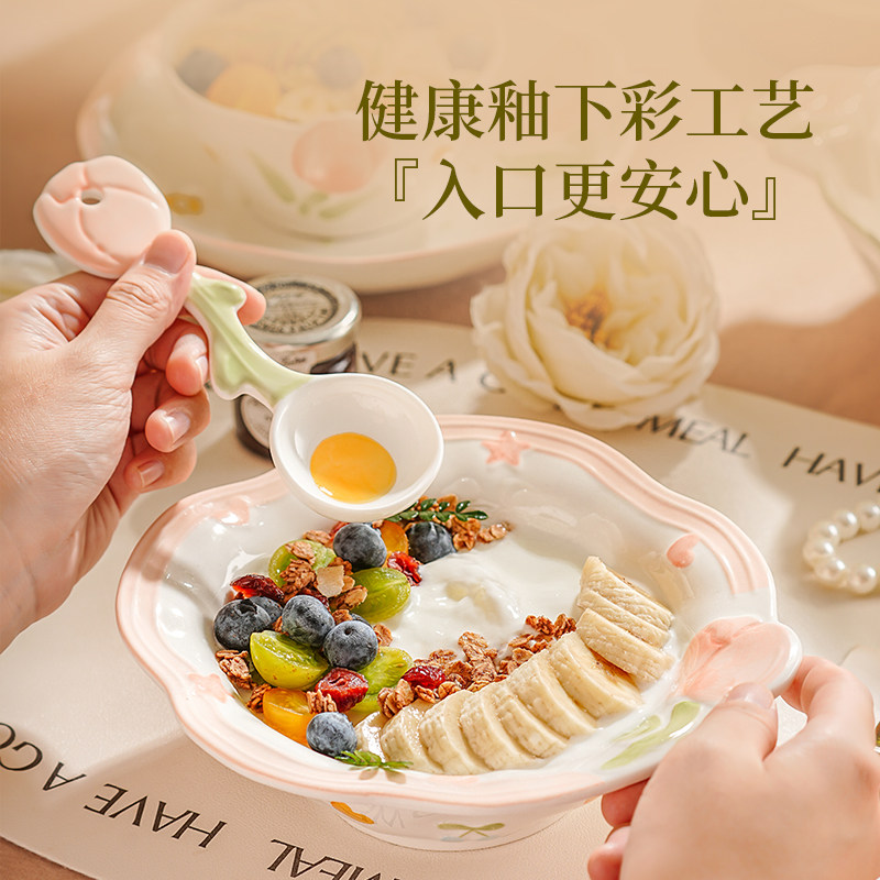 奶油风陶瓷碗家用卡通菜盘子可爱米饭碗汤碗釉下彩儿童餐具耐高温