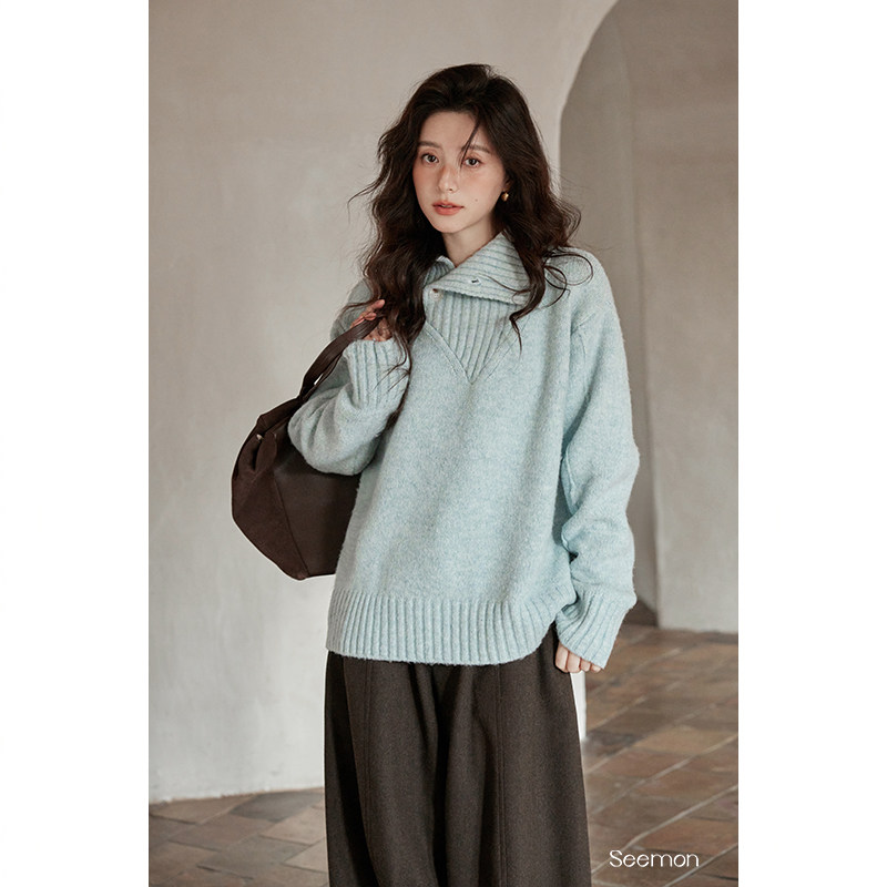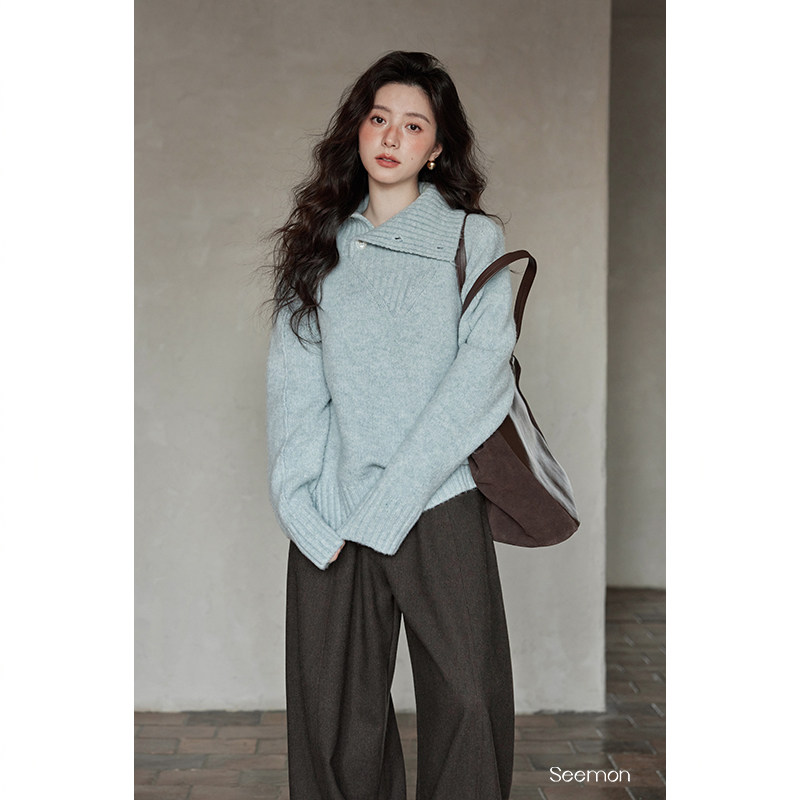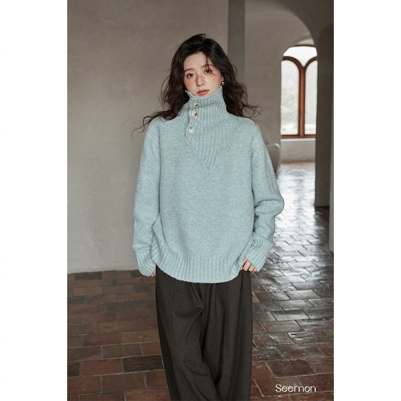夕蒙2026新款冬季韩系慵懒风宽松小个子软糯独特漂亮蓝色高领毛衣