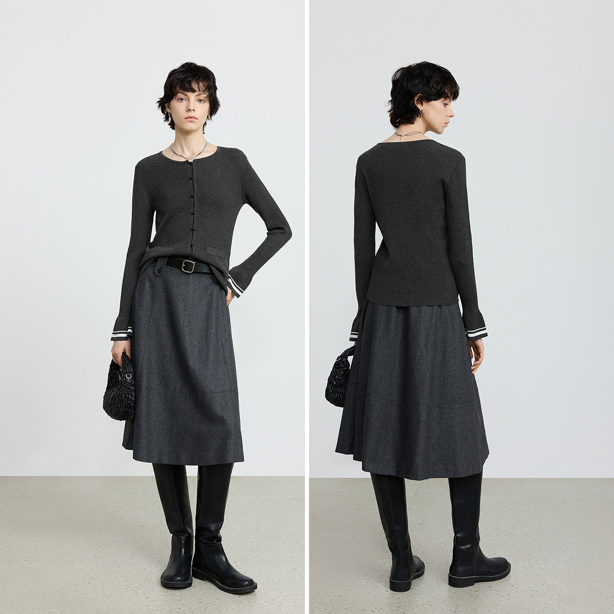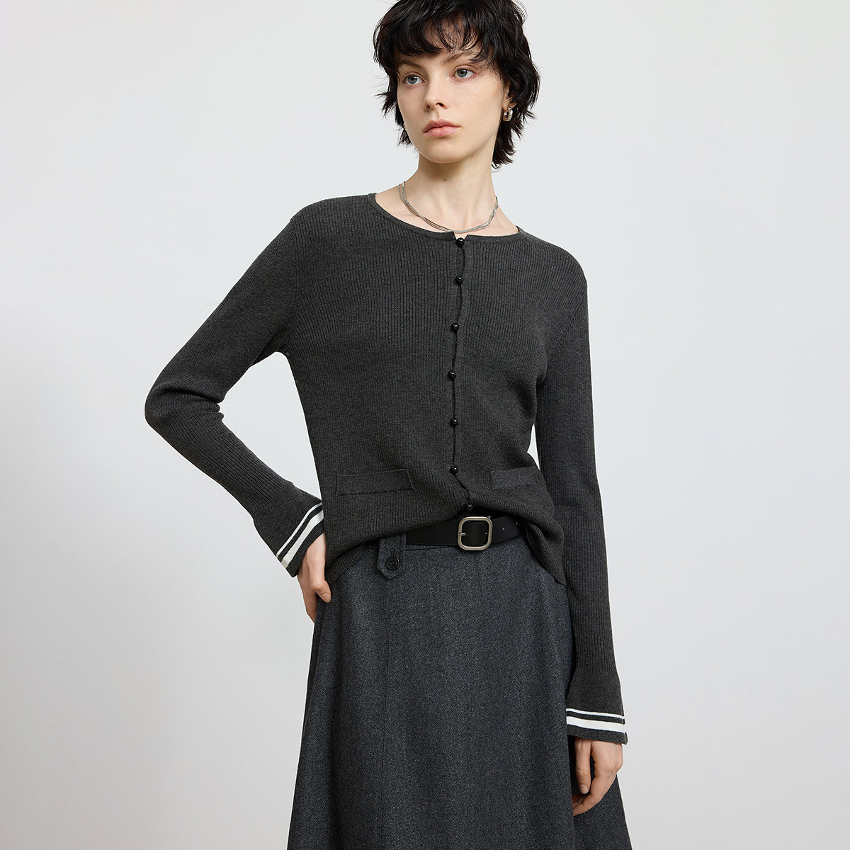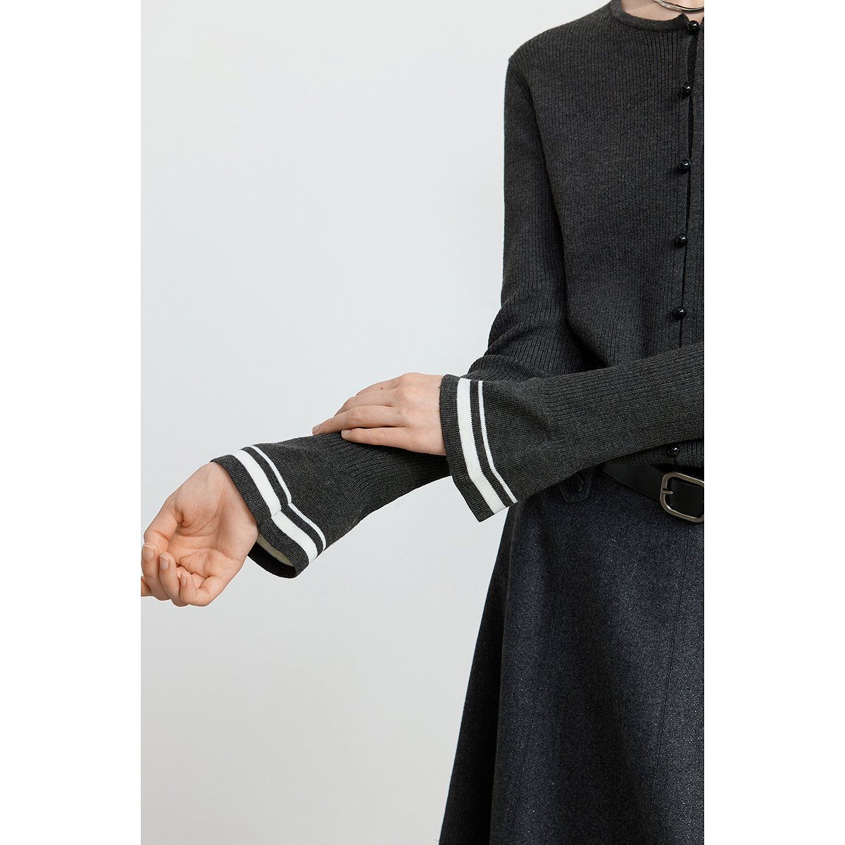 LILY2025冬新款含羊毛格雷系圆领撞色拼接条纹喇叭袖灰色针织衫女