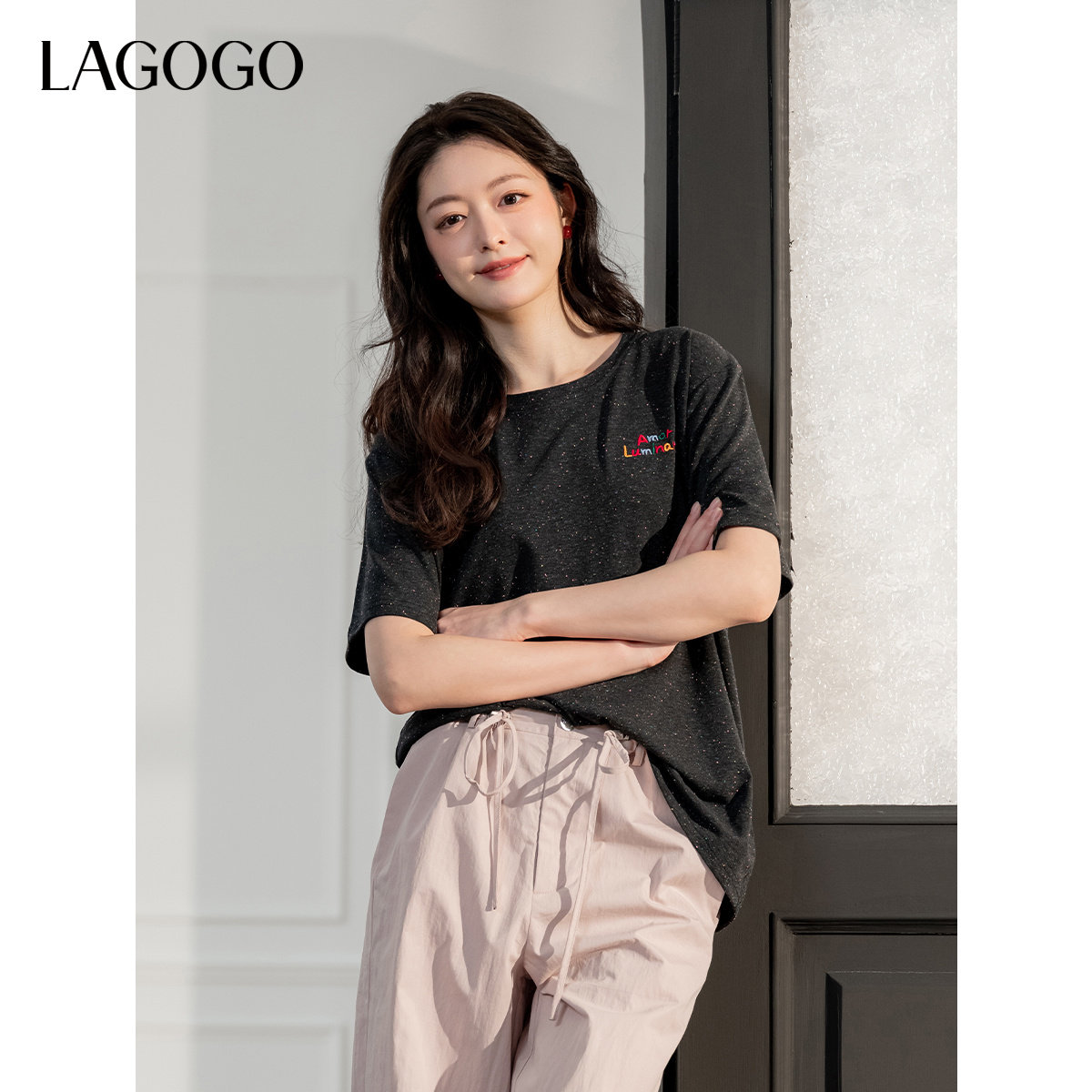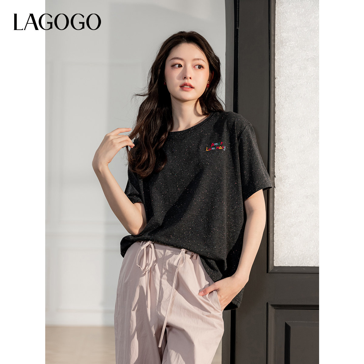 LAGOGO彩点柔软黑色T恤女拉谷谷2025春夏季新款舒适弹力显瘦上衣