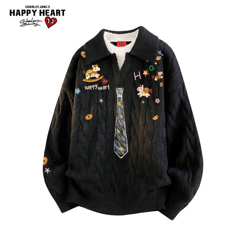 查尔斯桃心涂鸦领带假两件针织衫男马年2026冬季新款红色慵懒毛衣