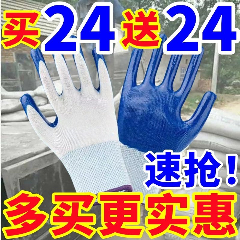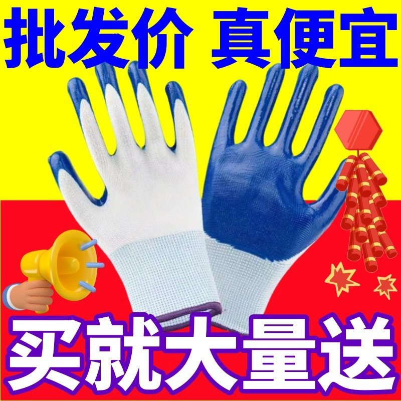 蓝白手套丁腈劳保耐磨工作防滑耐用工人通用防滑透气橡胶防水批发