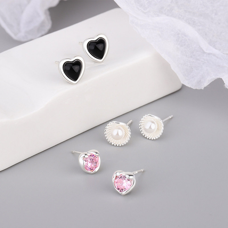 卡莱妮 s925纯银黑玛瑙心形耳钉珍珠贝壳耳钉少女心粉石耳钉耳饰
