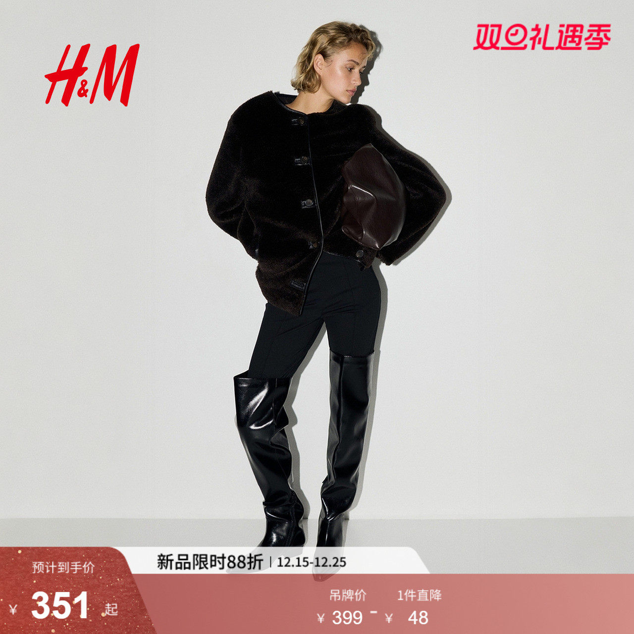 HM女装皮草2025冬季新款圆领气质时尚保暖毛茸面料外套1283071