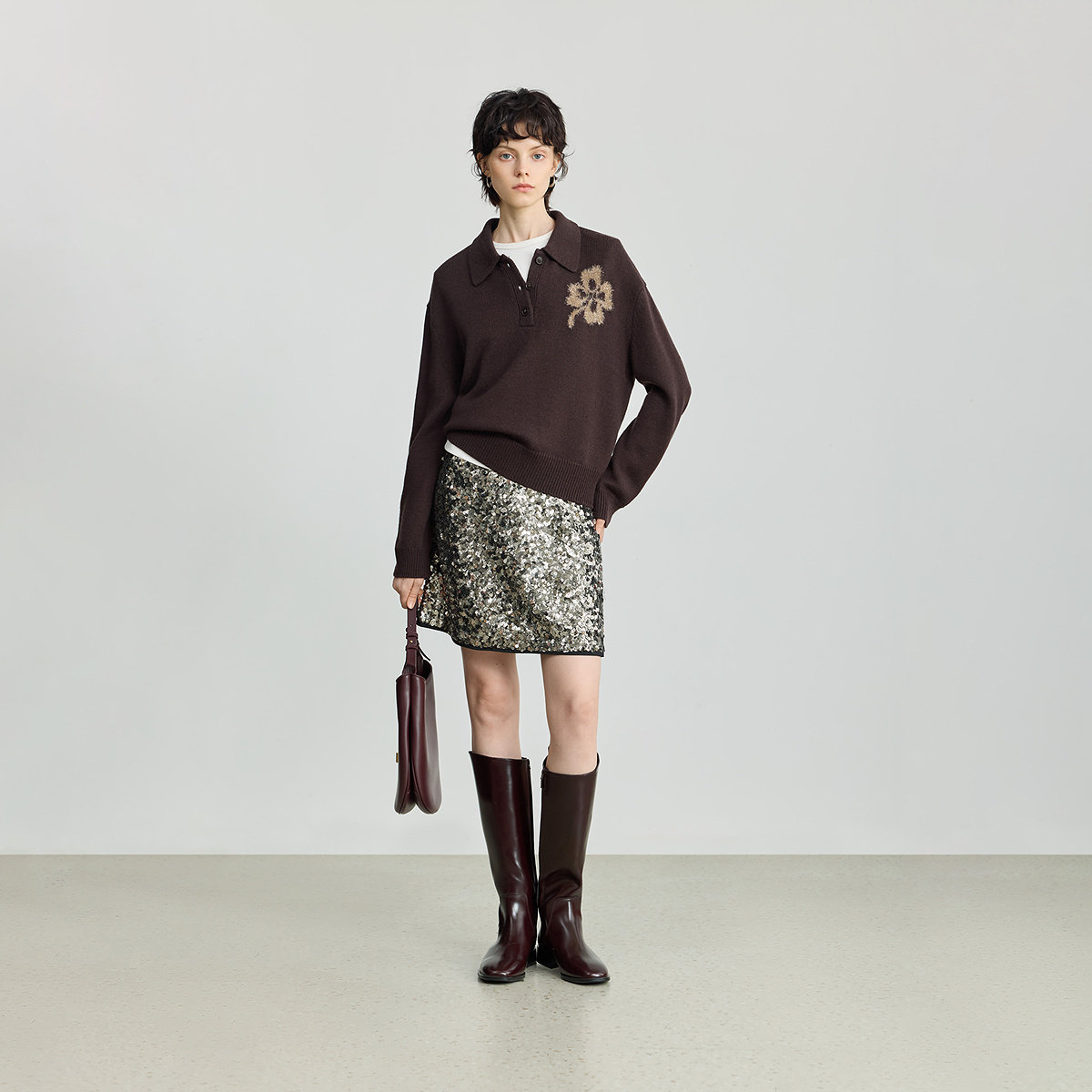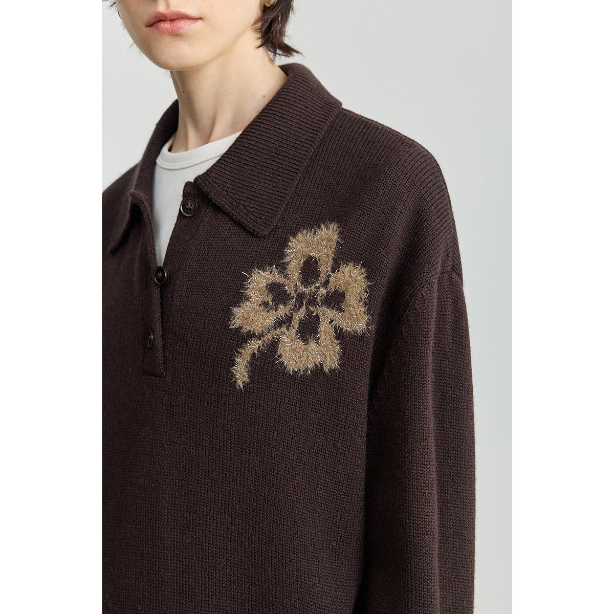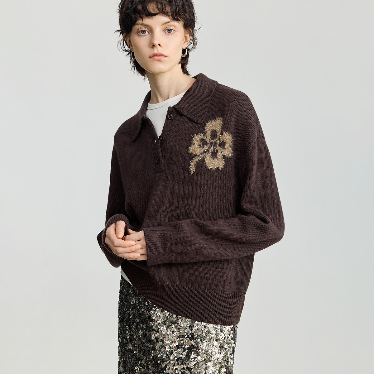 LILY2025冬新款女装羊毛混纺POLO领羽毛纱亮丝休闲通勤深色针织衫