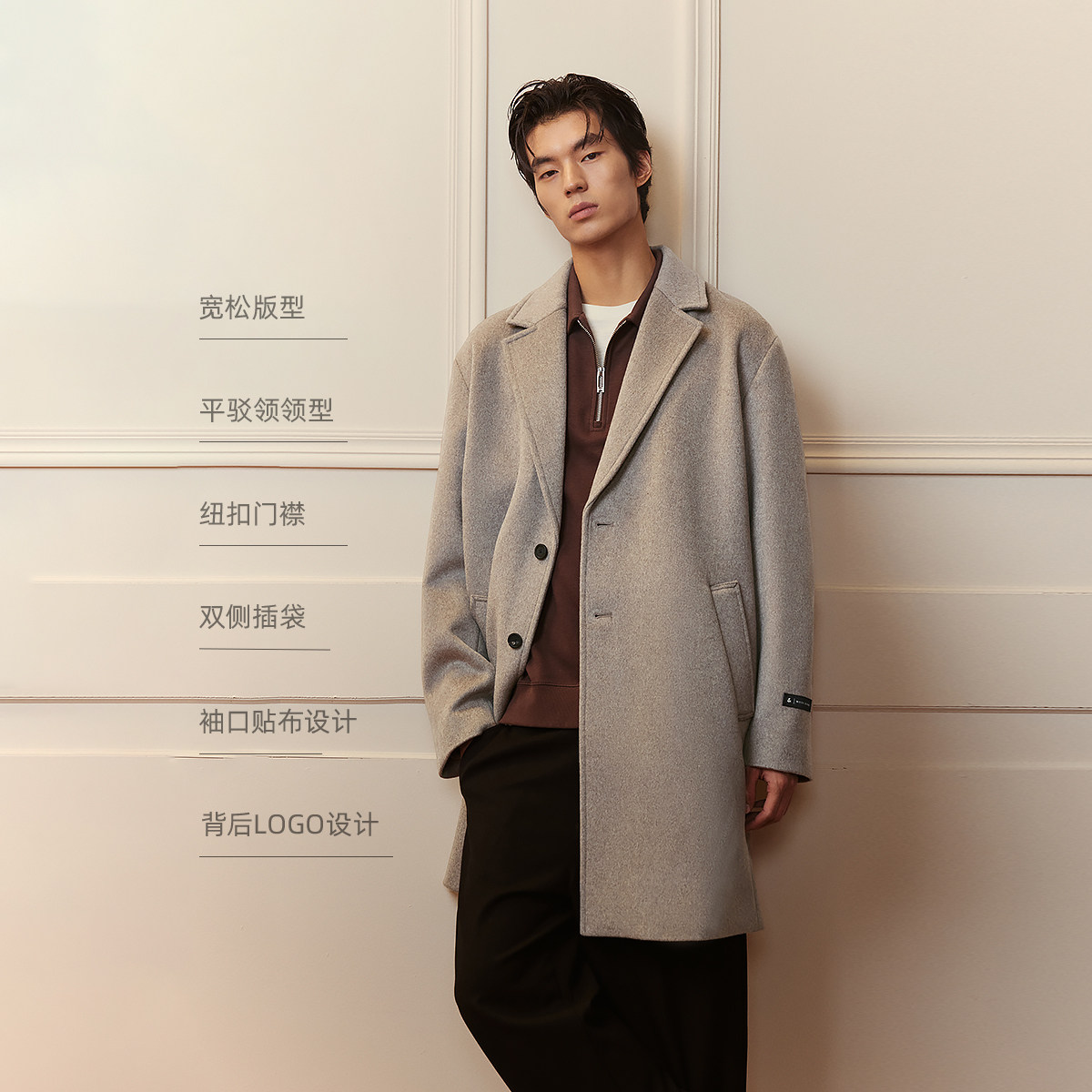 "1、宽松版型 2、平驳领领型 3、纽扣门襟