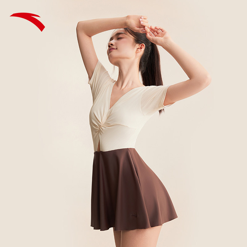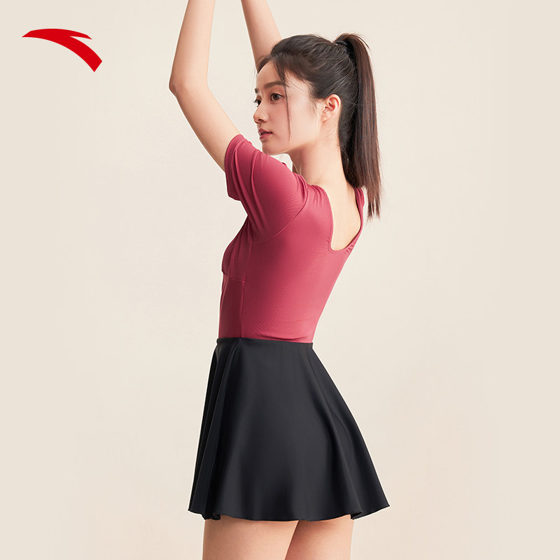 安踏连体泳衣女游泳短袖V领褶皱设计感柔软弹力裙式泳装温泉泳衣