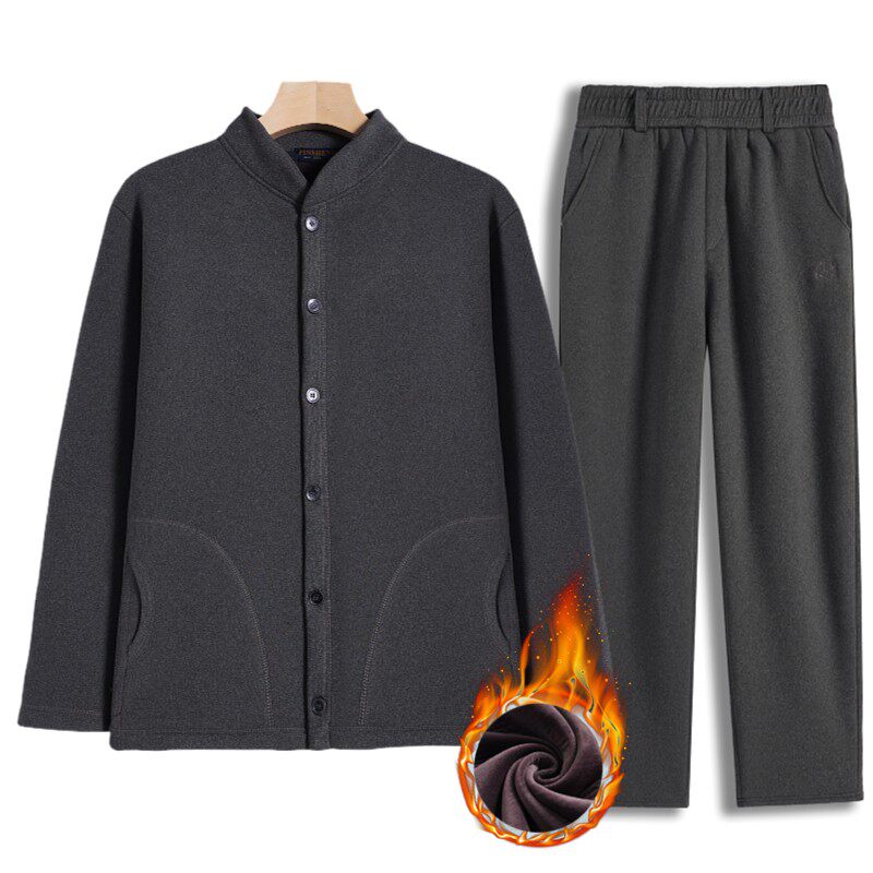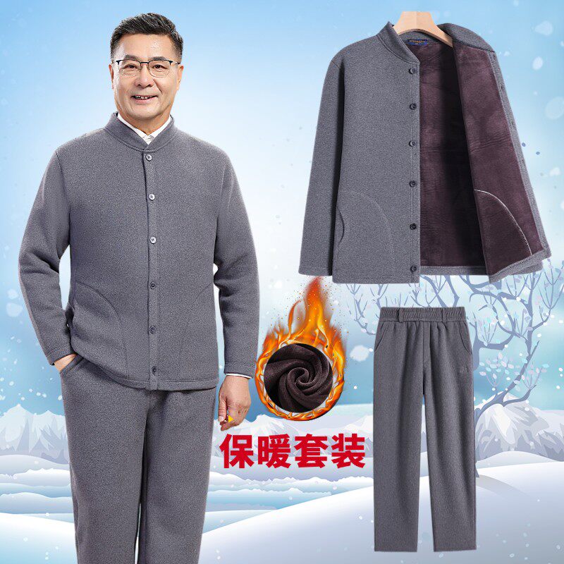 中老年男秋冬加绒加厚休闲上衣裤子套装爸爸装冬季宽松保暖2件套