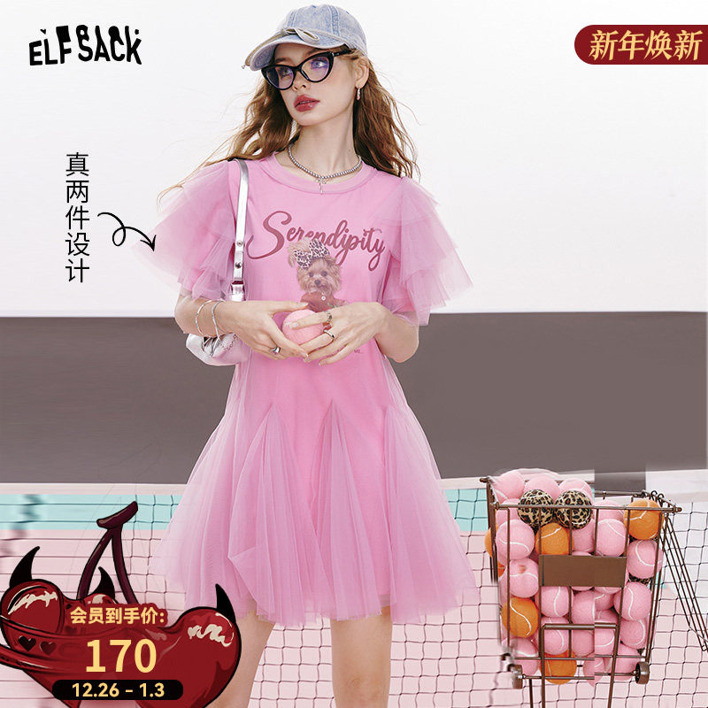 【叛逆甜心】妖精的口袋粉色网纱印花t恤连衣裙女2025夏新公主裙