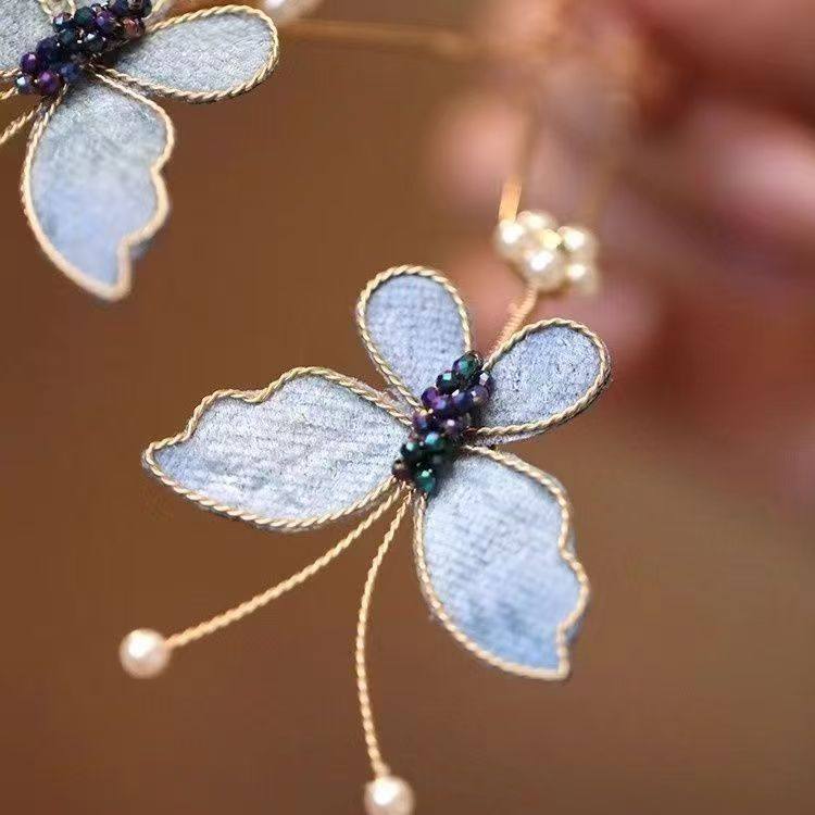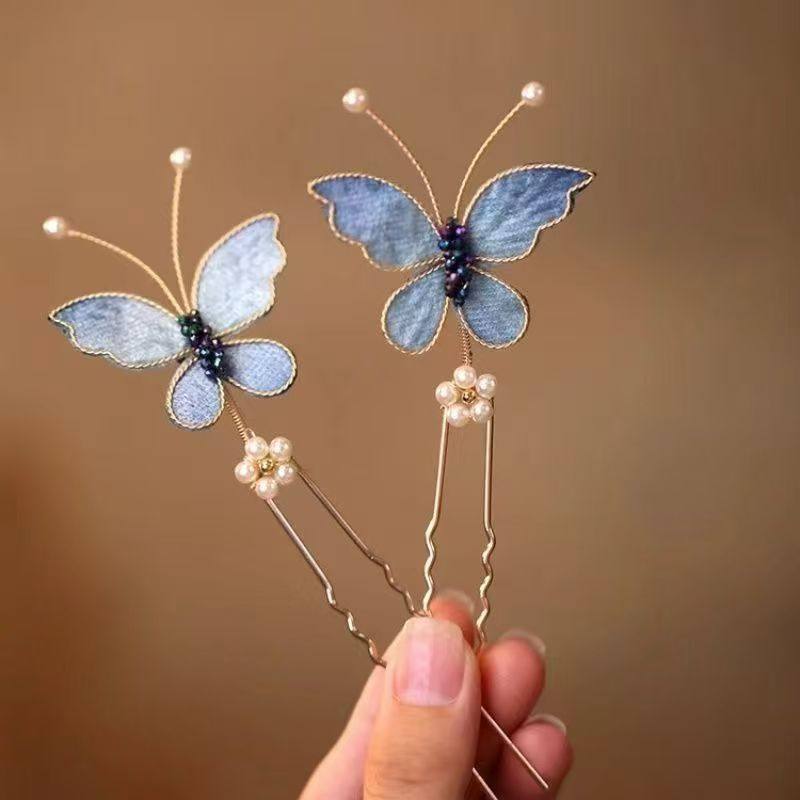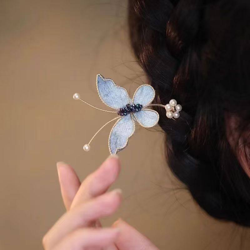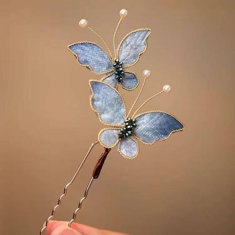 蝴蝶点缀U型发钗簪子女古风丸子头头饰蓝色汉服配饰 2024发饰发簪