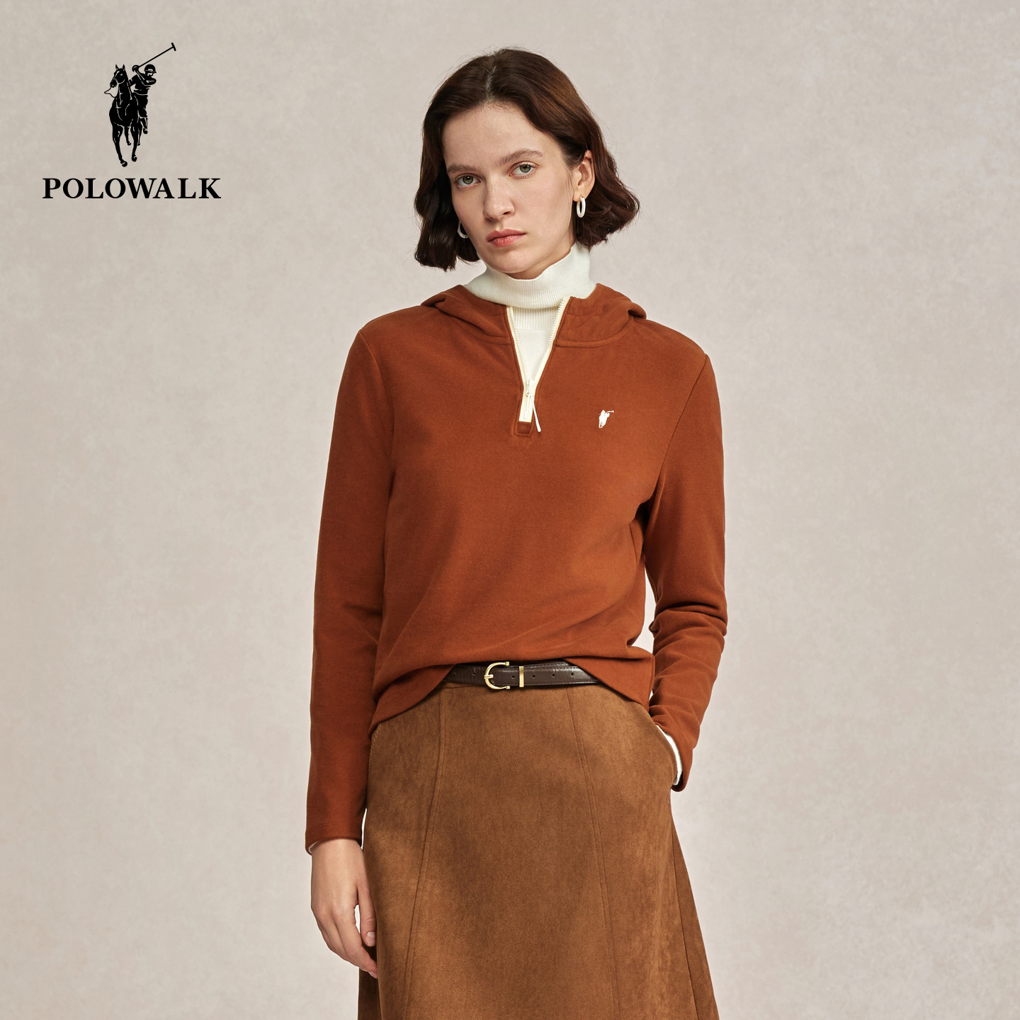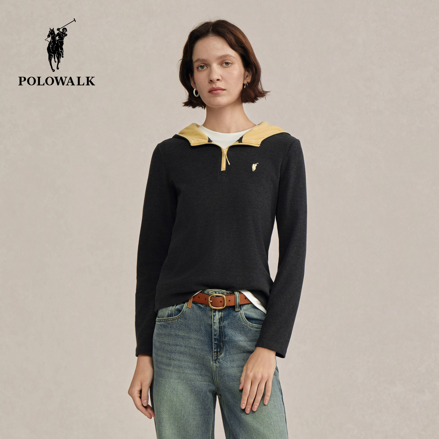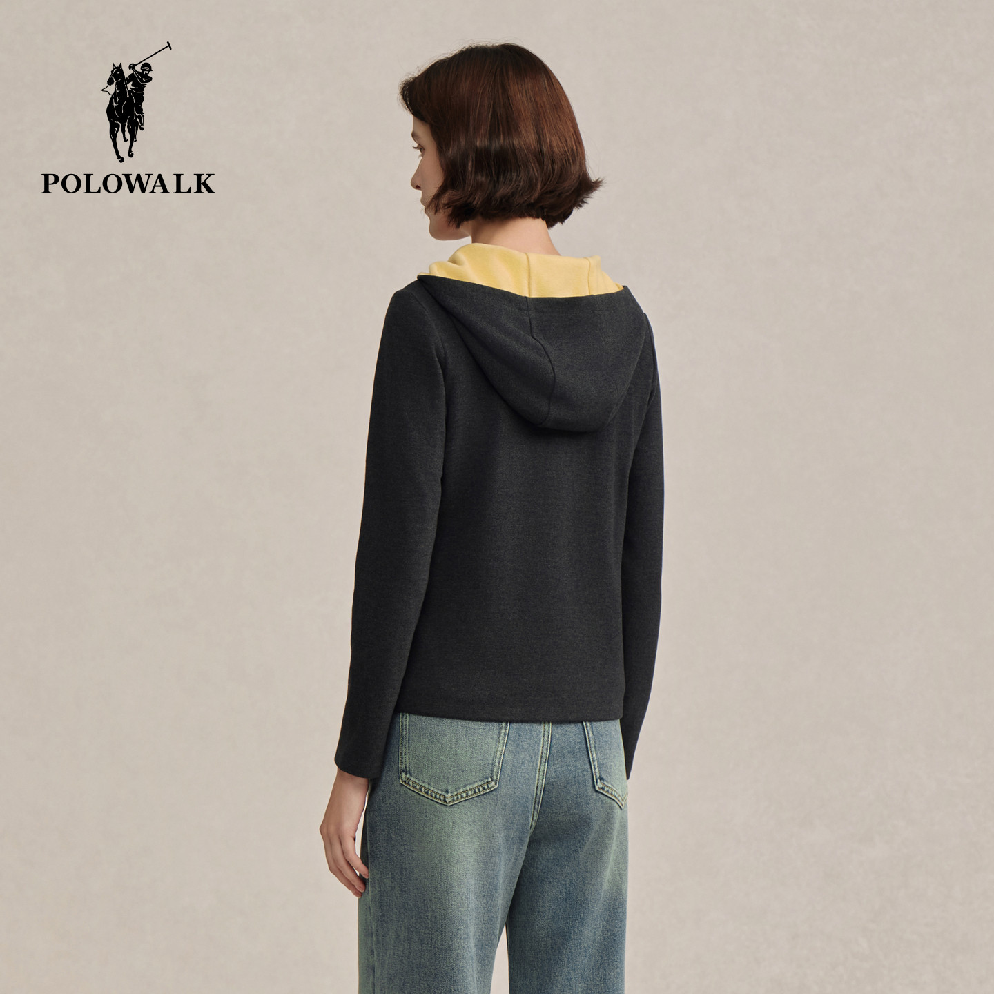 POLOWALK女式长袖T恤2025秋季新品女装显瘦休闲运动连帽长袖上衣