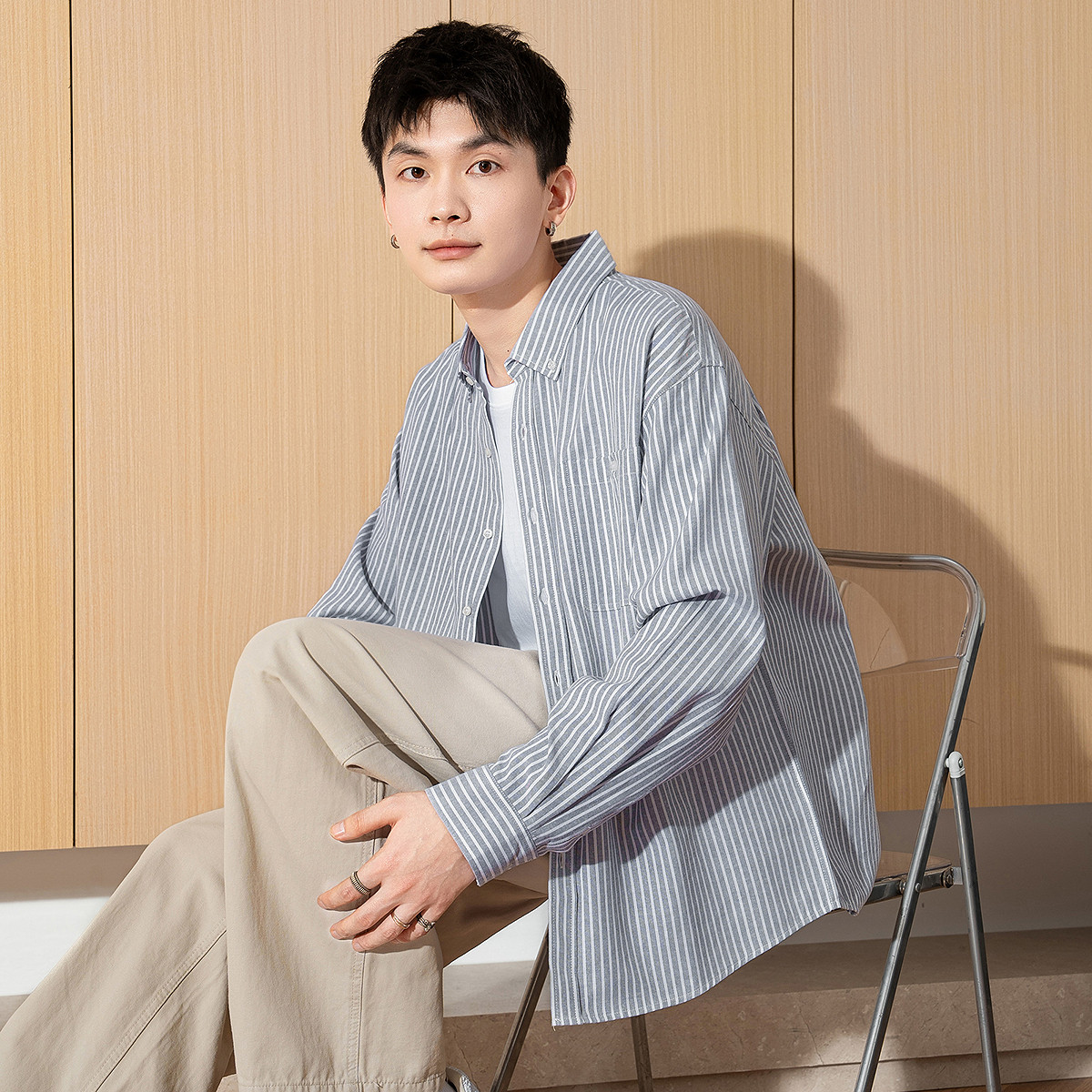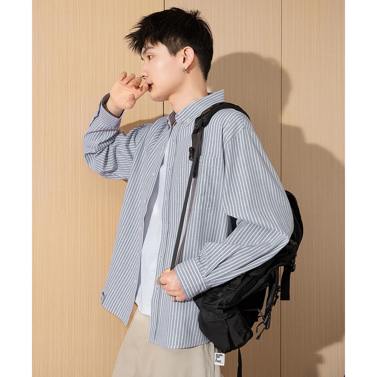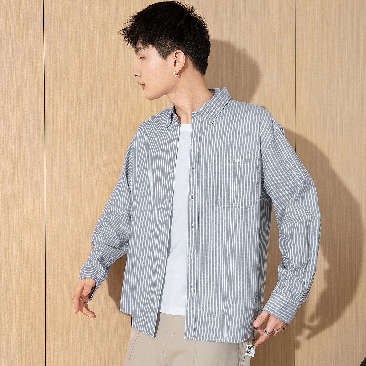 唐狮春季新款长袖衬衫男日系港风宽松衬衣青少年条纹衬衫外套TM
