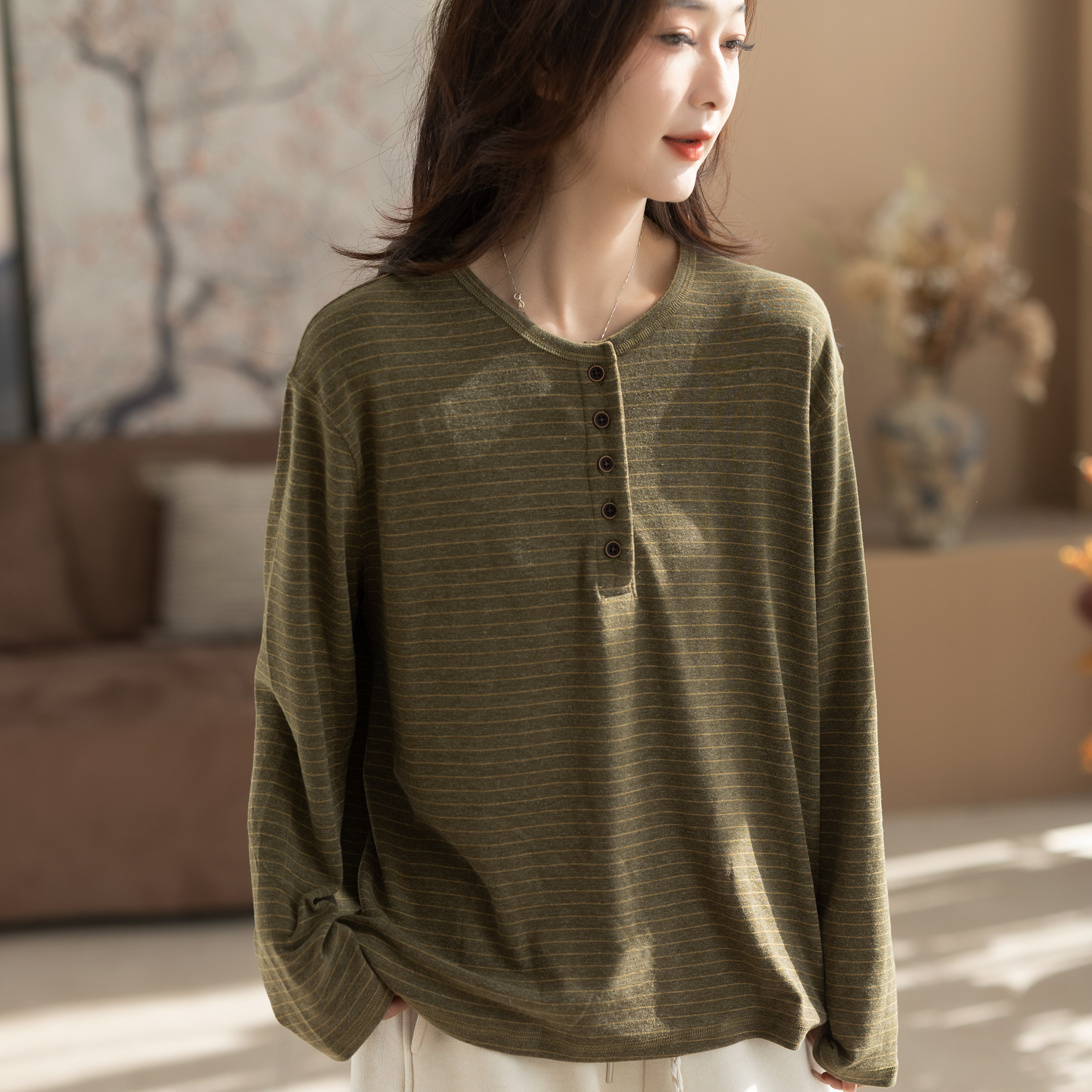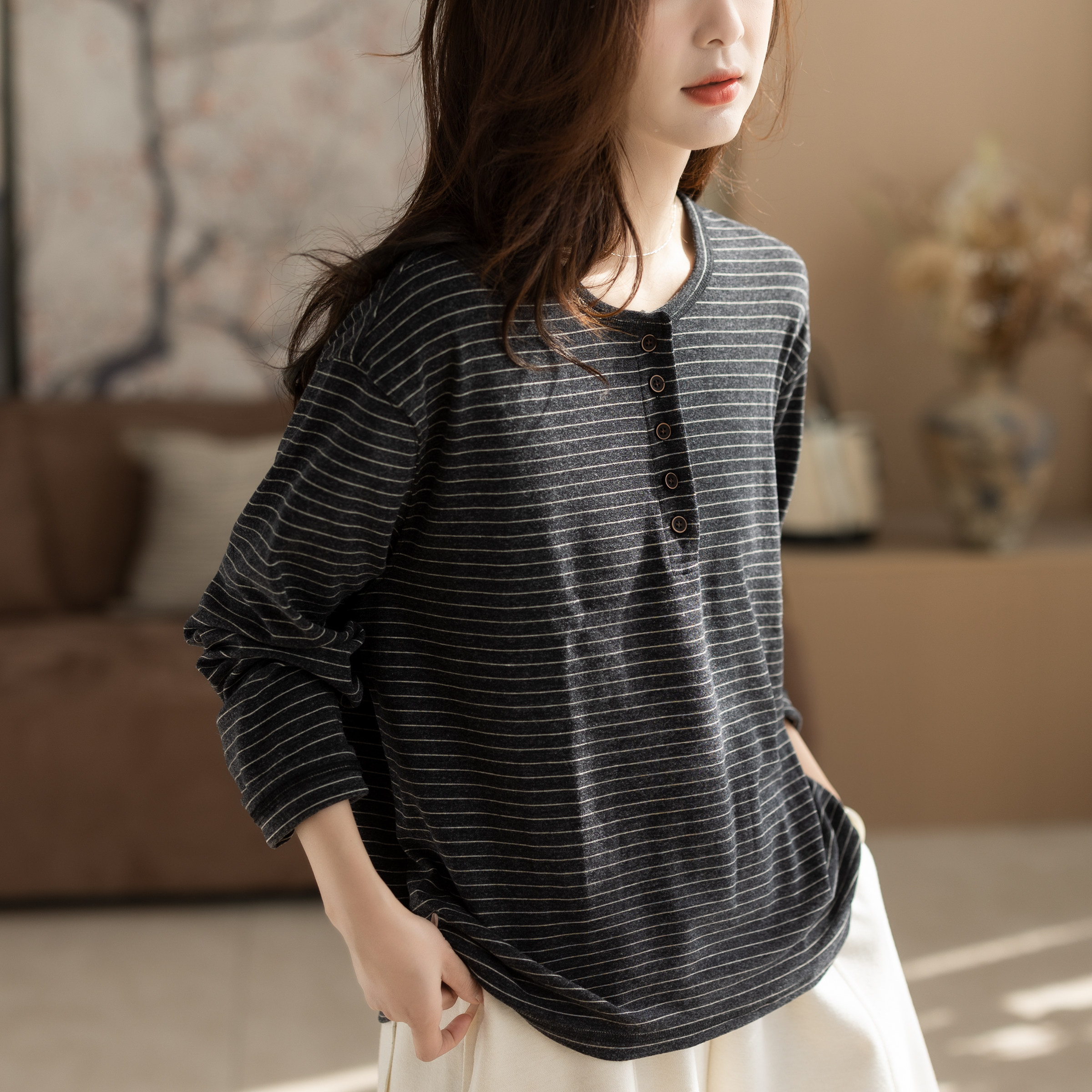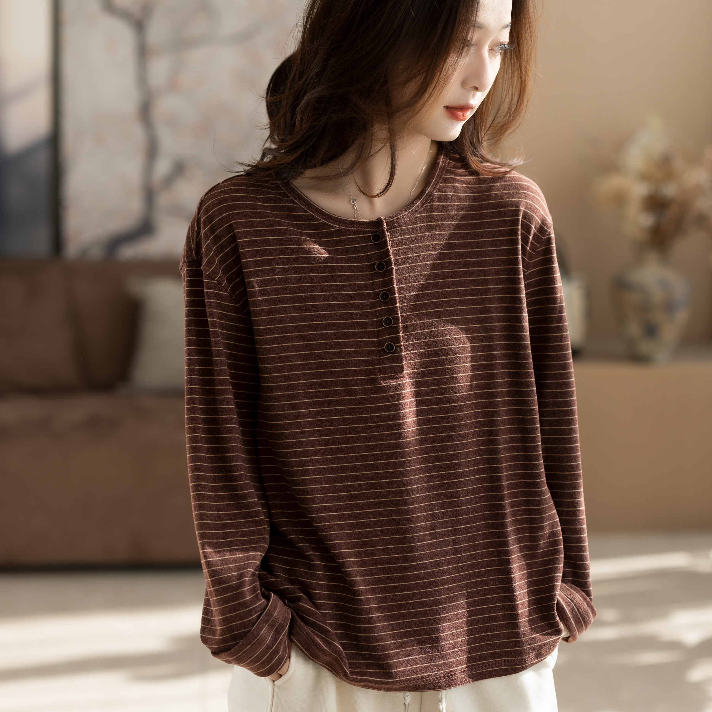 2025新款秋冬磨毛女士文艺圆领休闲棉质条纹好看女装上衣打底衫女