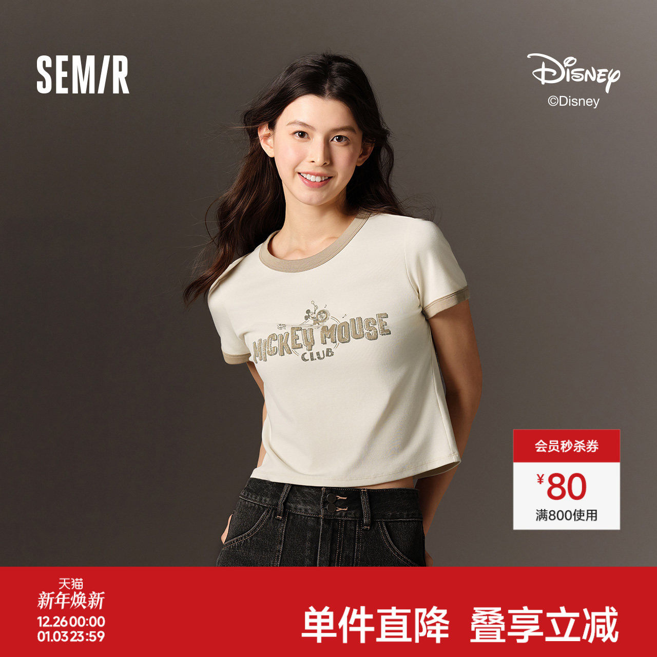 森马迪士尼合作系列短袖T恤女短款图案修身2025新款夏季撞色上衣