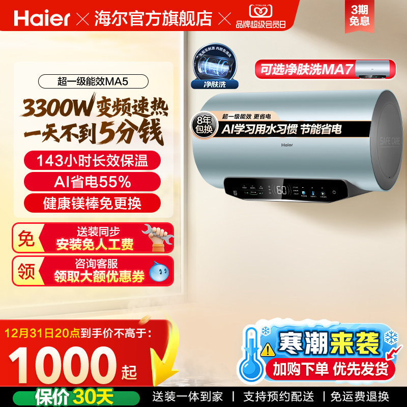 [政府换新补贴]海尔电热水器家用洗澡超一级能效60L免换镁棒MA5