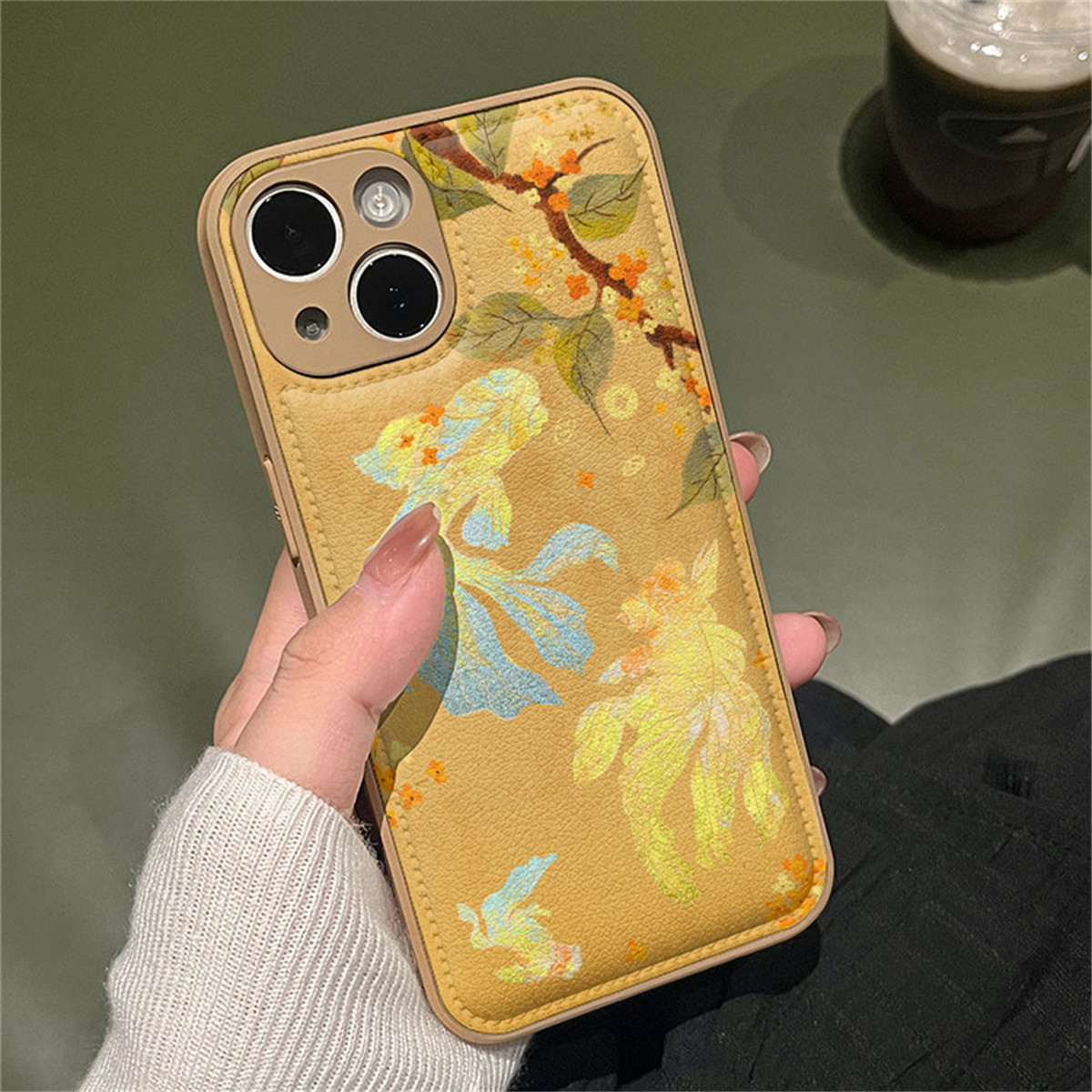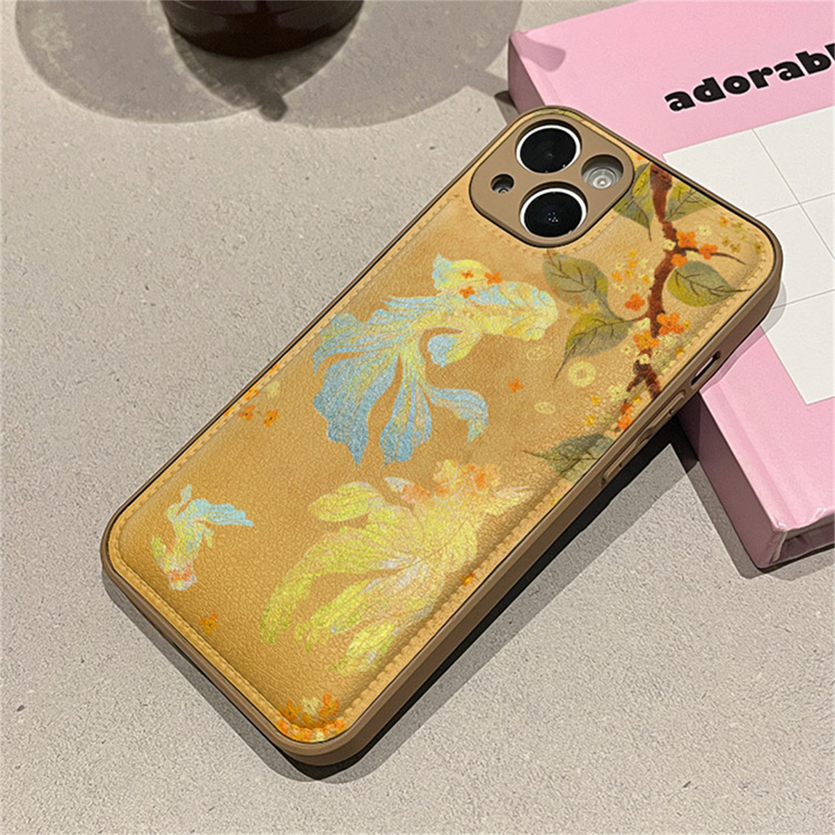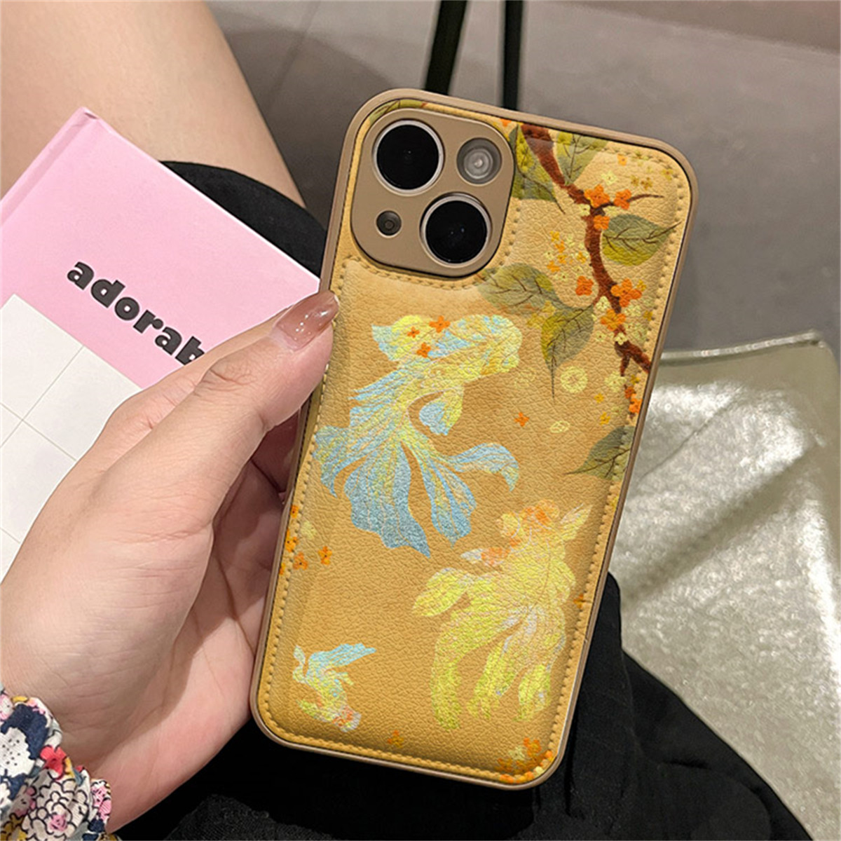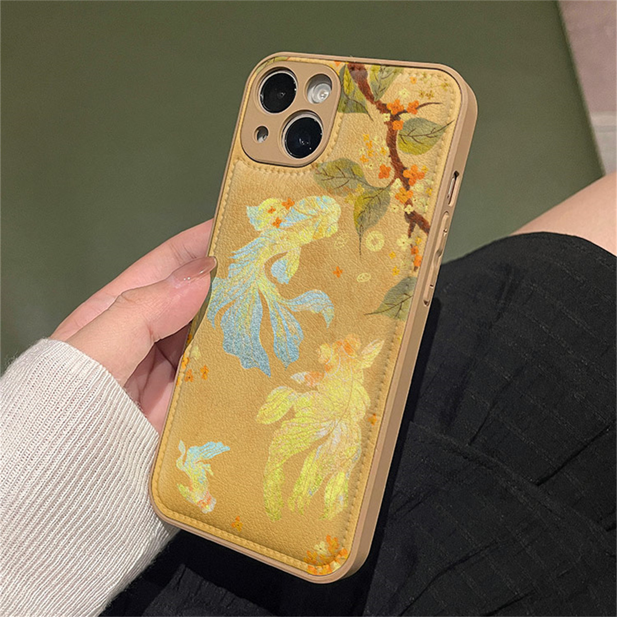 新中式渐变金色锦鲤适用苹果16promax手机壳皮纹iphone15新款17全包11皮纹14plus气垫13pro防摔xsmax保护套