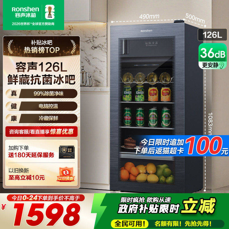 容声 126升办公室冰吧玻璃门家用客厅小型冰箱酒柜冷藏保鲜冷柜