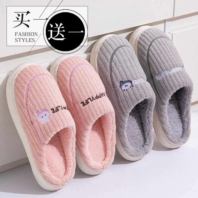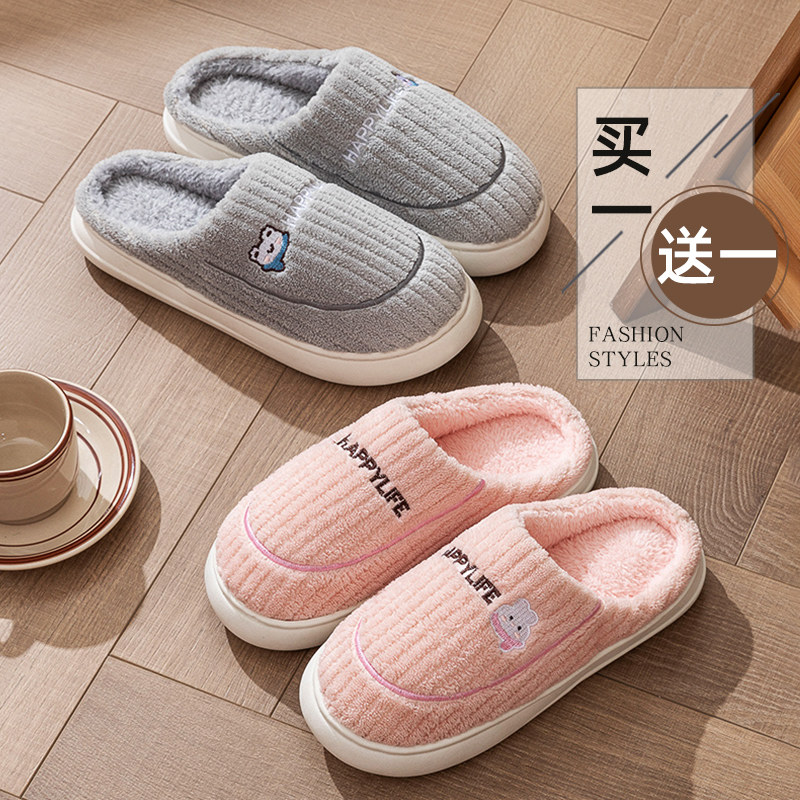 买一送一棉拖鞋女2025冬季软底家用情侣拖鞋男款毛绒时尚简约冬日