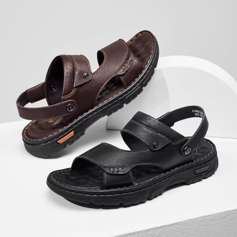 老人头凉鞋男2026夏季牛皮休闲外穿沙滩鞋真皮防滑中老年爸爸拖鞋