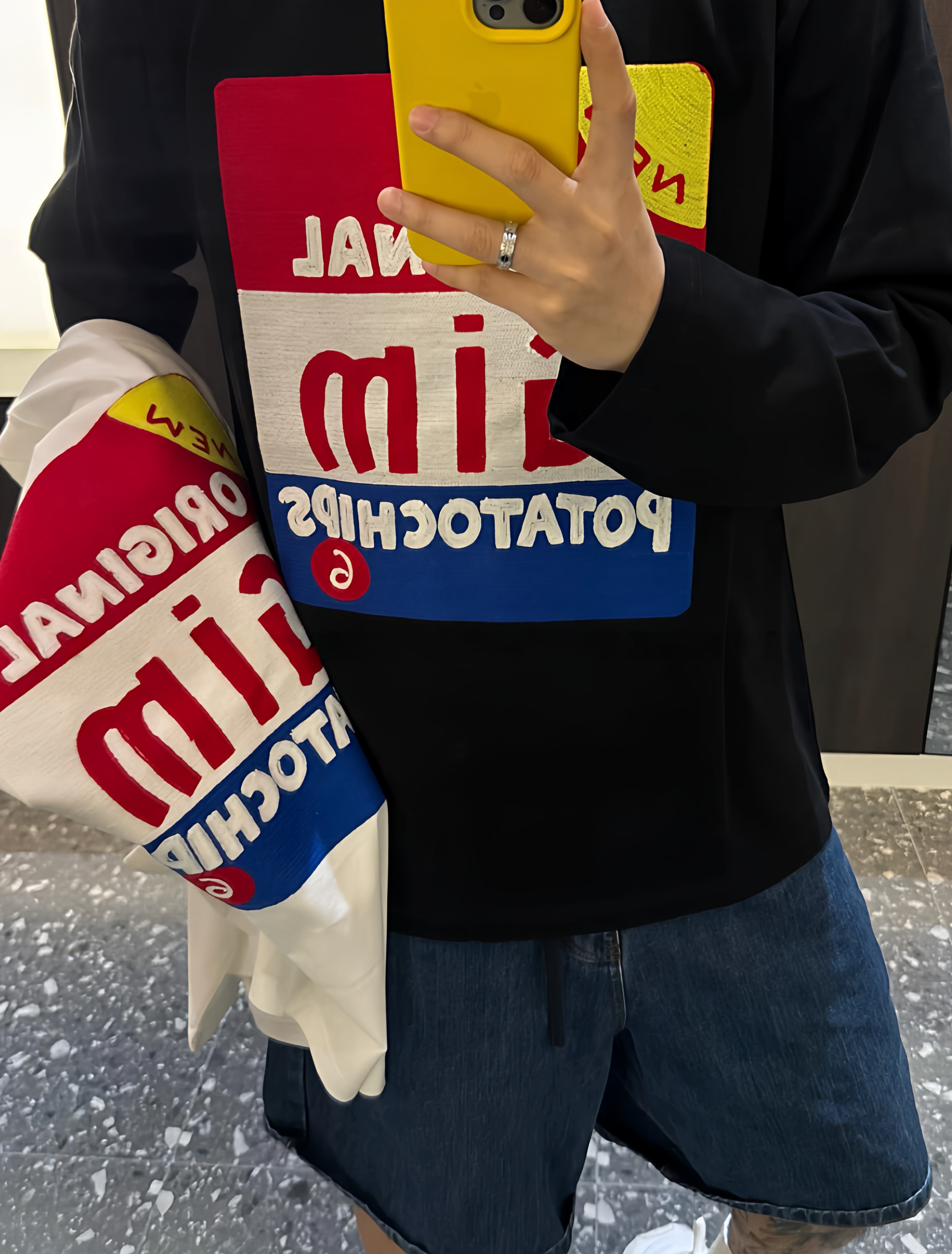 【陈发财】FA CAI新款im薯片标牌刺绣长袖T男女同款情侣款小领口