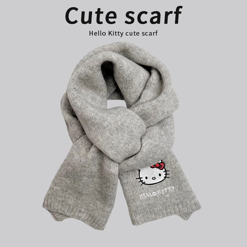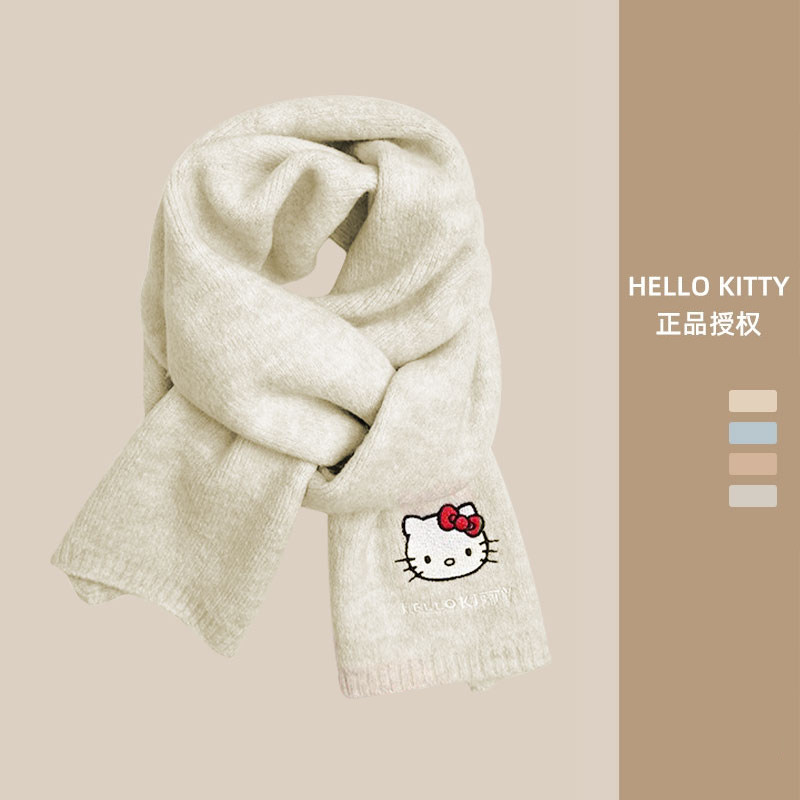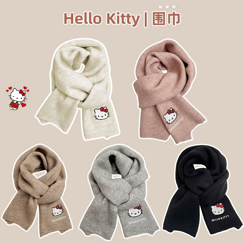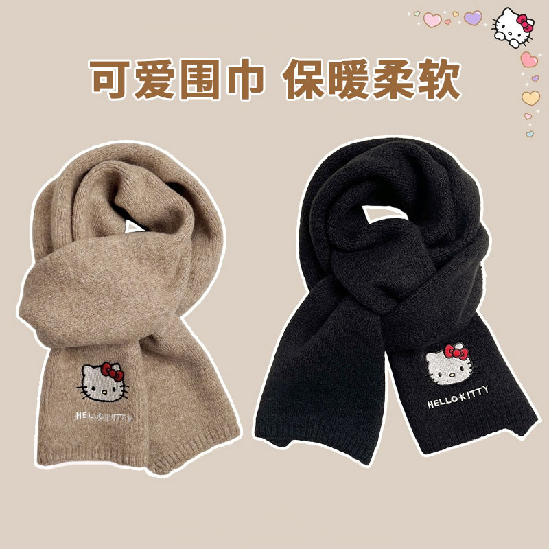 HelloKitty凯蒂猫针织刺绣围巾女秋冬季保暖围脖学生灰色黑色粉色