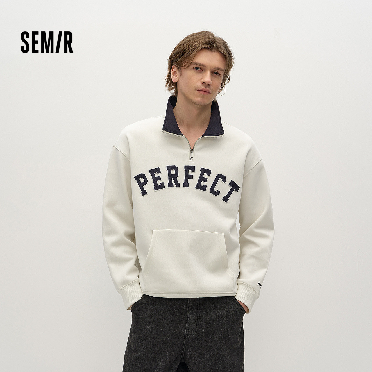 商场同款|森马卫衣男秋季复古学院风刺绣2025新款半开襟立领上衣