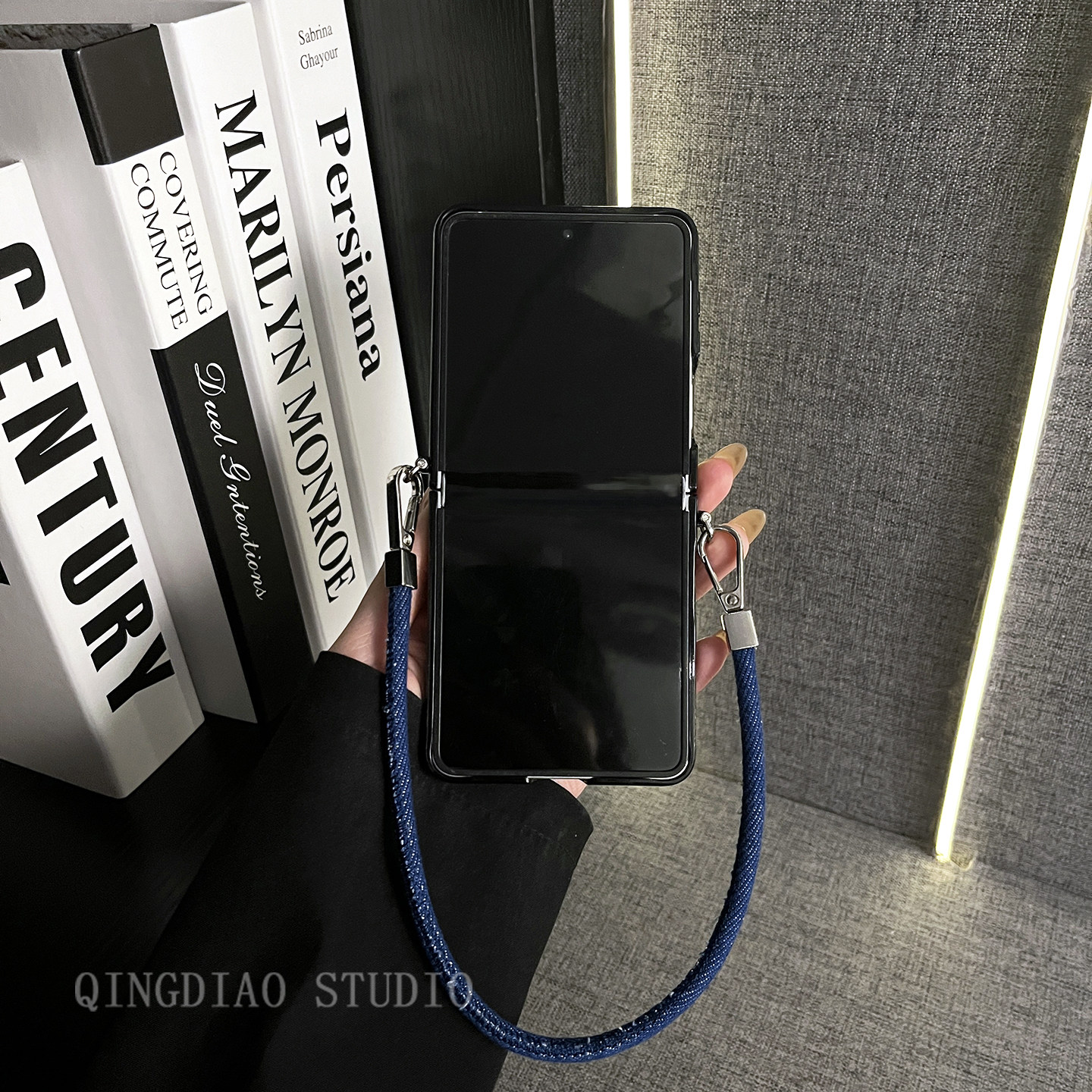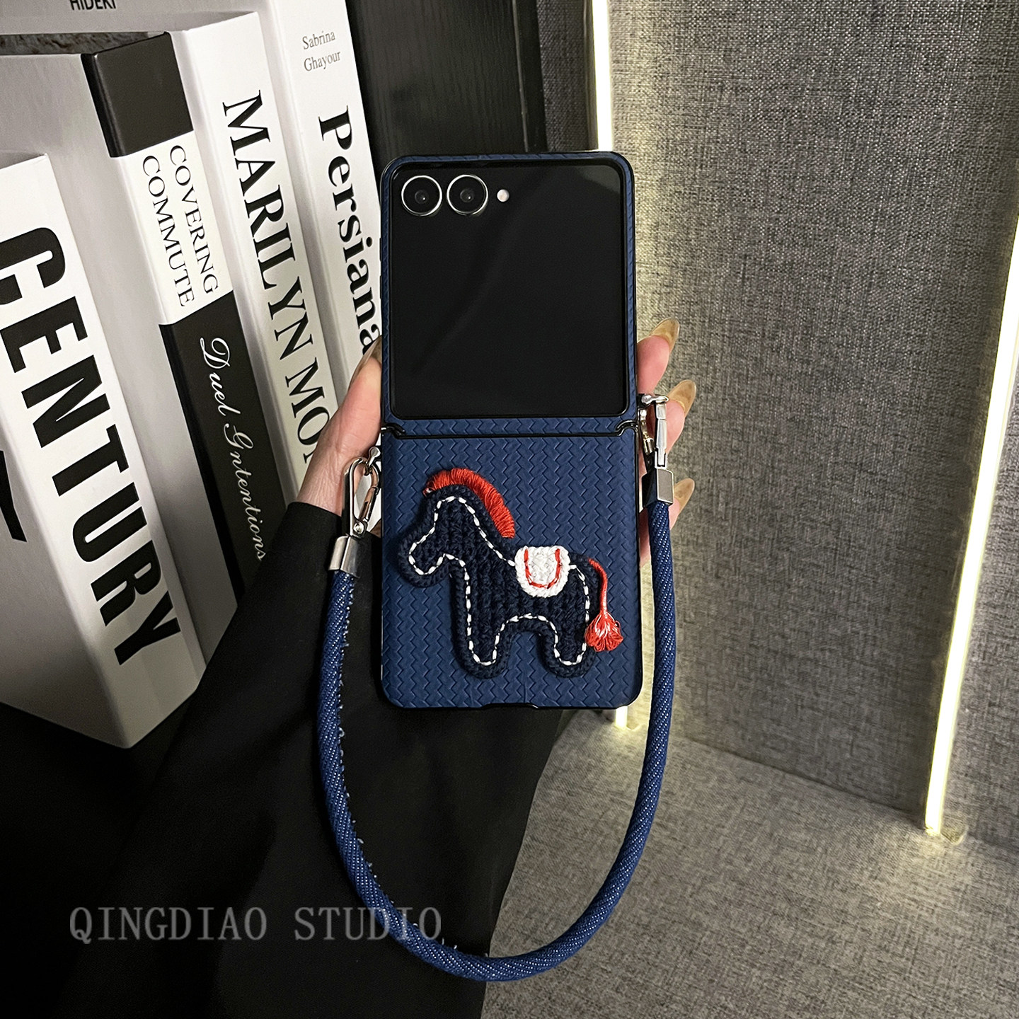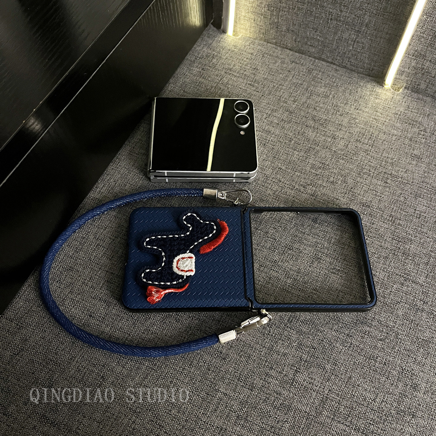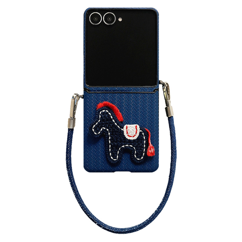 轻调 2026新年国潮深蓝草席纹针织马牛仔手提绳适用于三星zflip7/6/5GalaxyW25Flip手机壳新款折叠屏翻盖防摔