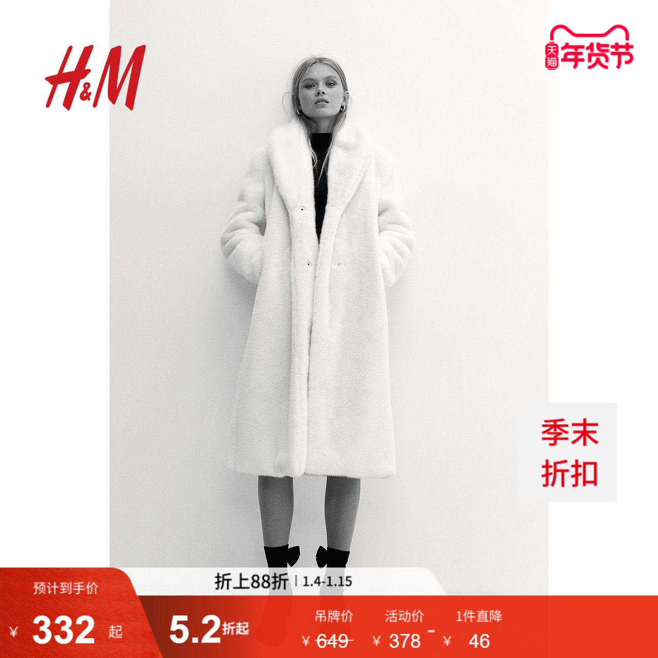 HM女装毛呢外套冬季仿皮草保暖加厚蓬松绒感大衣毛毛外套1255553