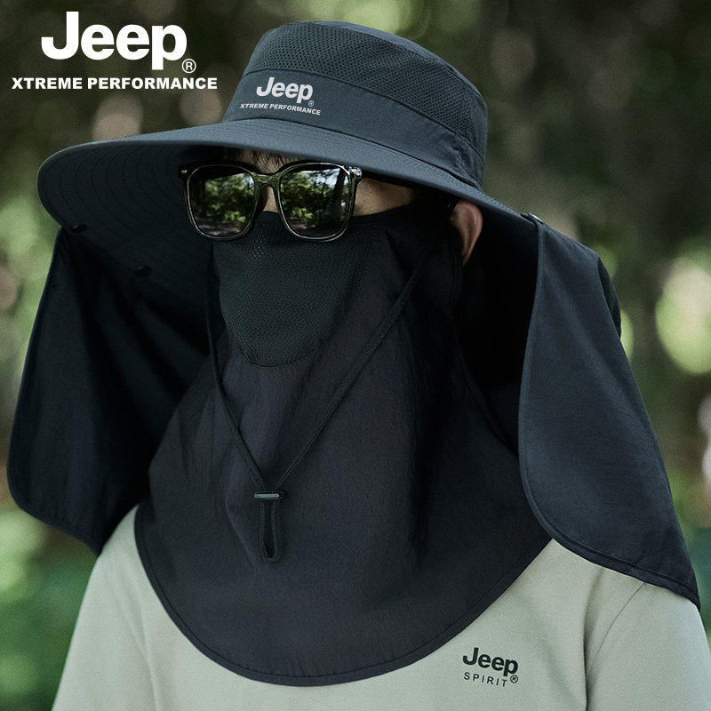 jeep吉普夏季男士防晒帽子户外登山钓鱼大檐护颈渔夫帽全脸面罩男