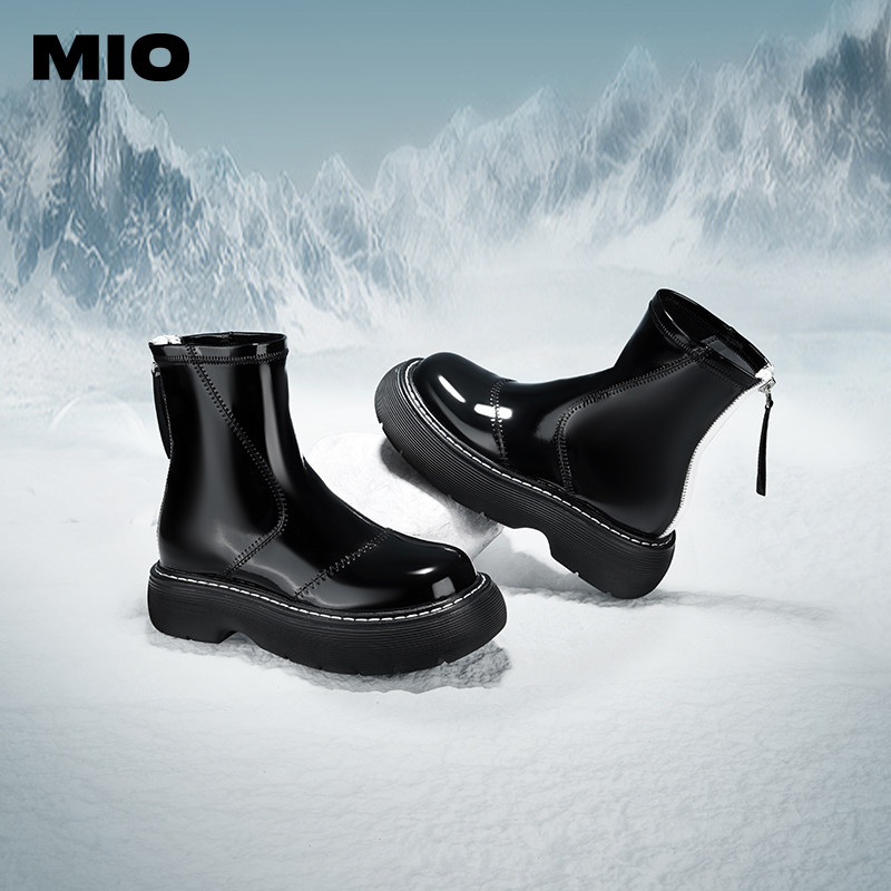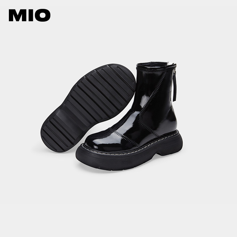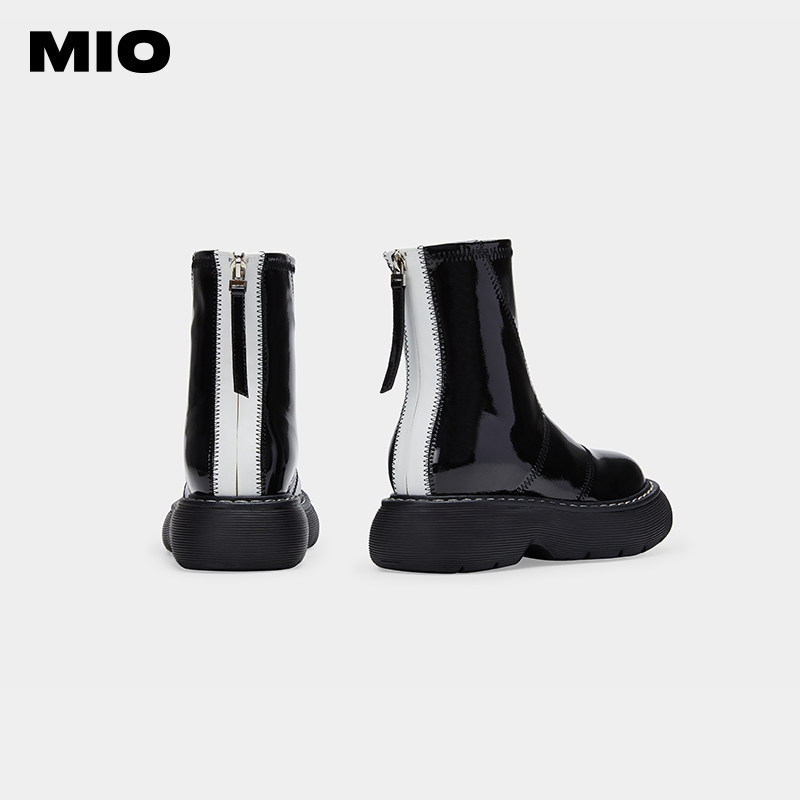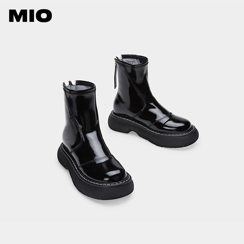 MIO米奥亮面短靴厚底机车潮流冬季时尚弹力靴显瘦袜靴黑色马丁靴