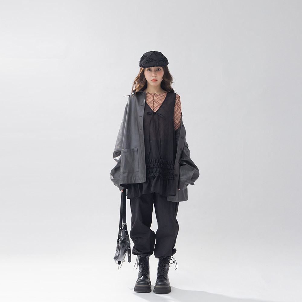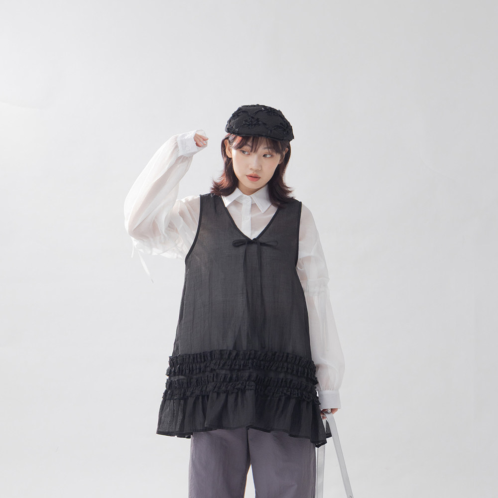 QUEENSHOP 2025秋冬新品女装V领下摆立体木耳边透肤背心01099282
