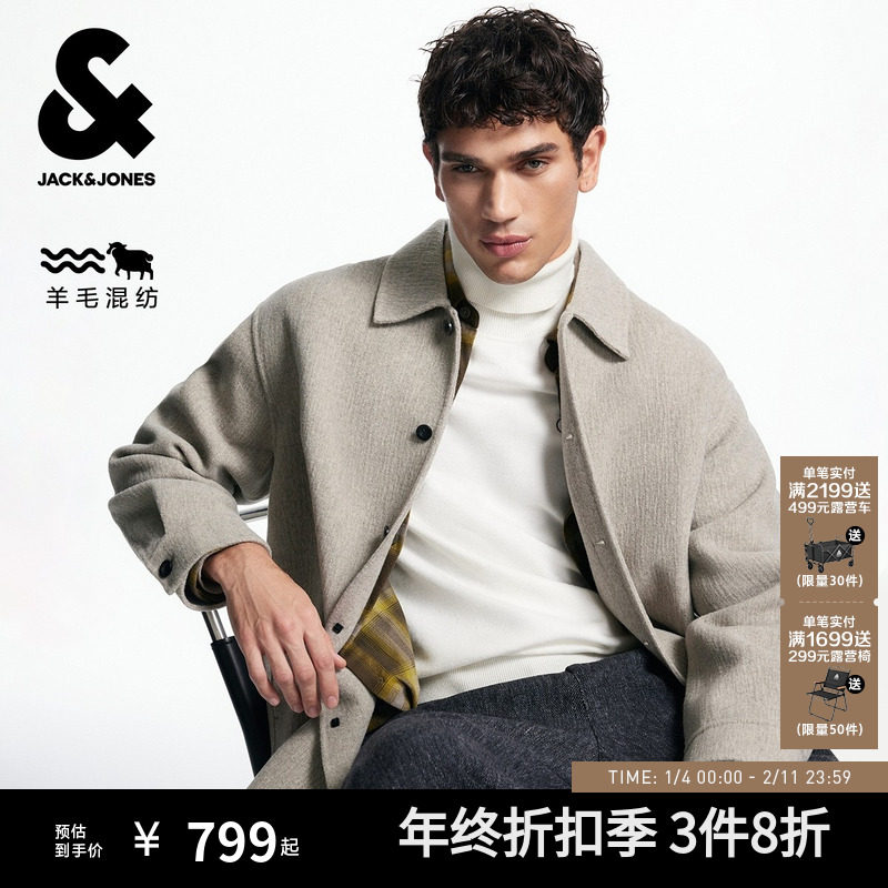 杰克琼斯男装士秋冬新款毛呢大衣时尚百搭长袖宽松尖领潮流上衣
